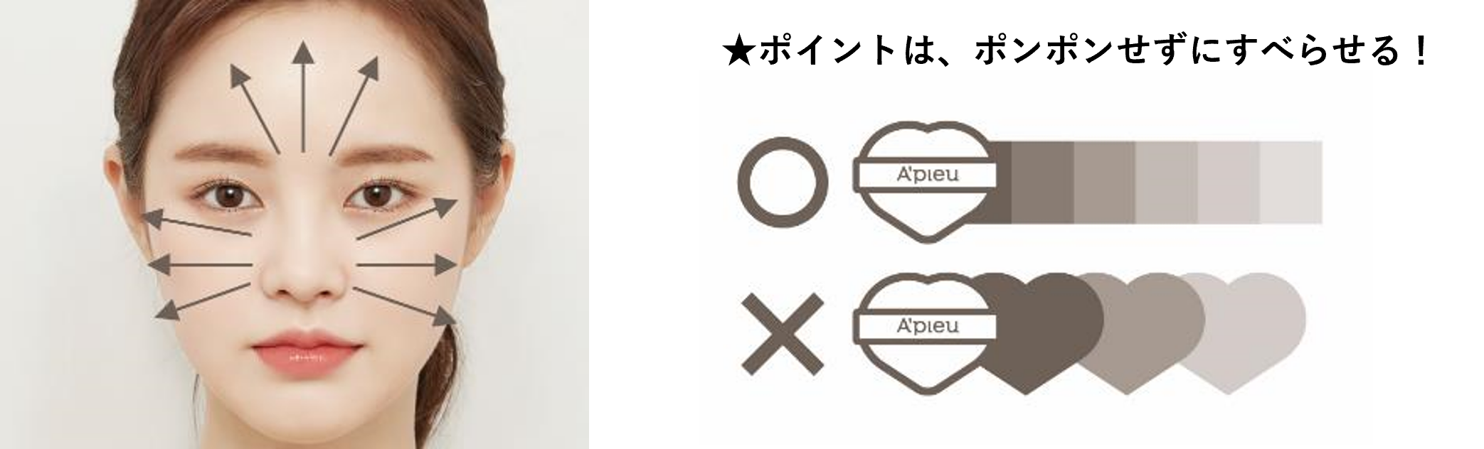 ②肌のキメに沿って、すべらせてなじませる。特に気になる部分には、指で塗りこむ。