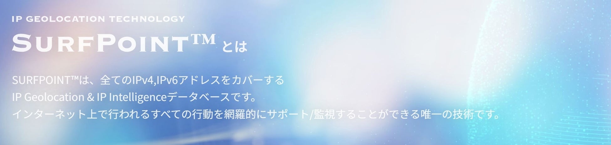 「SURFPOINT」はインターネット上のすべてのIPv4とIPv6をカバーする、IPアドレスと位置情報や企業情報など様々な情報を紐づけたIP Geolocation & IP Intelligenceデータベースです。