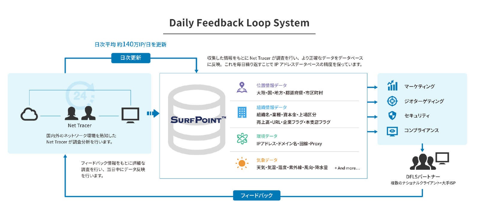 ※3 DFLSとは、IPアドレスに関する情報を調査し、専任のスタッフ(Net Tracer)が情報をもとに調査・検証作業を行い、データベースに反映、この一連の作業を日次で行う取り組みのことを指します。IPアドレス情報を収集するチャネルは多岐に渡り、自社構築したデータ収集サーバー群によるデータ収集分析プロセスは常時稼働しています。さらに複数のナショナルクライアント様や大手ISP様からのフィードバック情報をもとに詳細な調査を行っています。