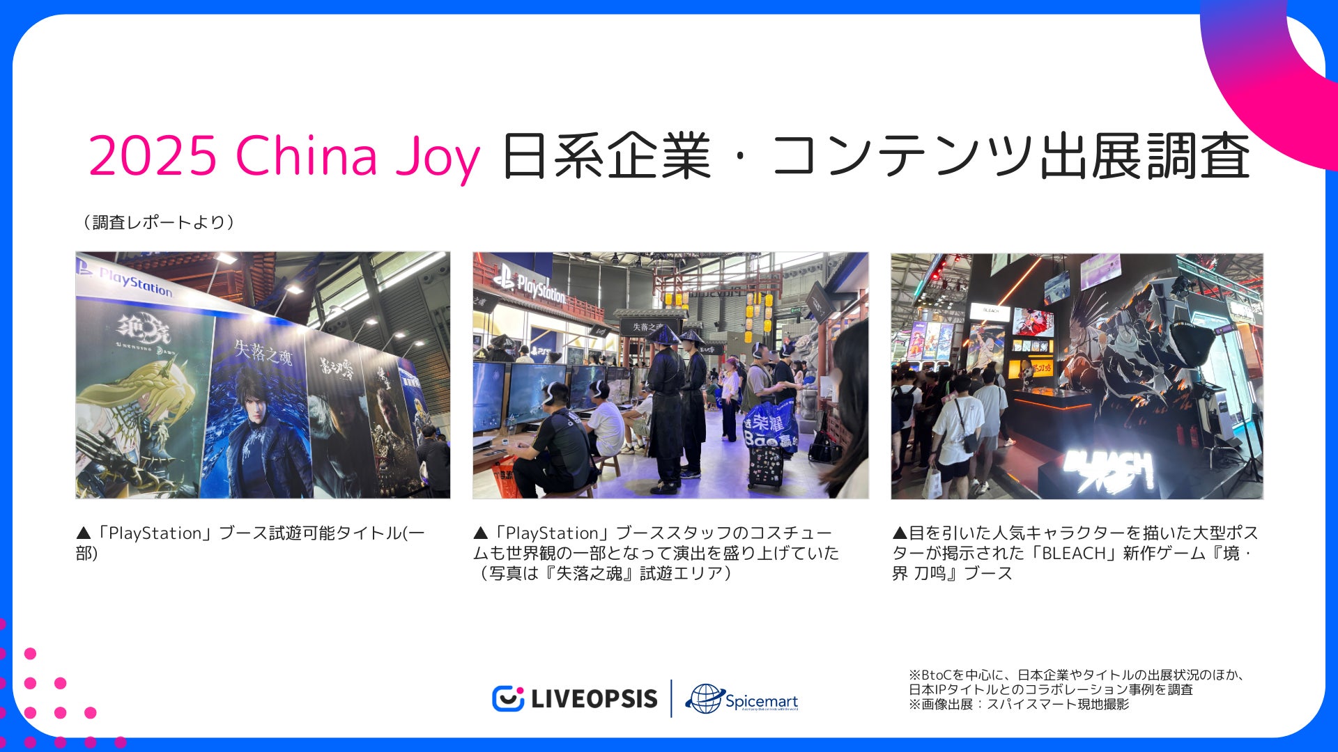 本調査は、スパイスマートが提供するスマホゲーム専門の運営ソリューション「LIVEOPSIS」会員向けに、定期的に配信している海外ゲームイベント調査の一環です。海外市場への進出を検討する企業にとって、来年以降の出展方針を検討する際の判断材料となることを目指すと同時に、来月開催される「東京ゲームショウ2025」と合わせ、中国市場における日本企業やIPの動向を把握することで、アジア市場戦略を読み解く手がかりとなると考えています。