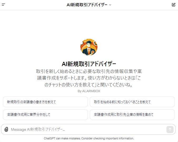 AI与信管理サービスを提供するアラームボックス株式会社(本社:東京都新宿区、代表取締役:武田浩和、以下「当社」)は、OpenAI社が提供するGPT Storeに企業調査会社のノウハウを持つAI与信管理チャットサービス「AI新規取引アドバイザー」の提供を開始します。
