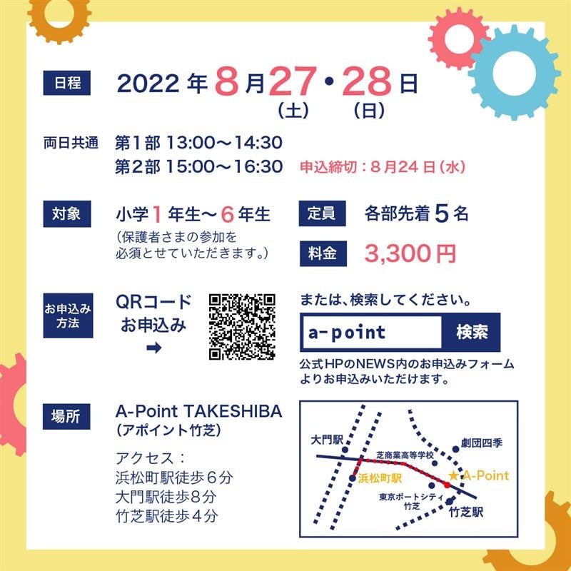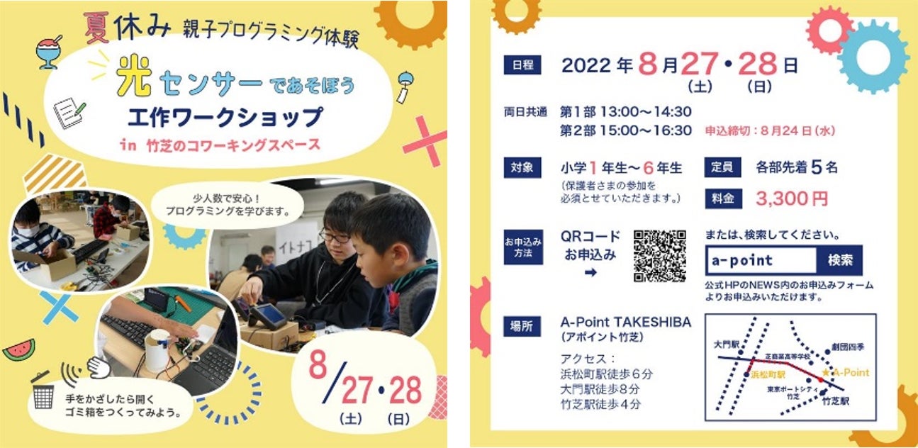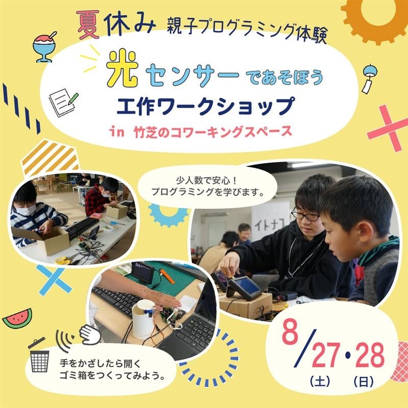 | ・体験内容 ①プログラミング用パソコン「IchigoJam」の操作 ② 光センサーを利用したIoTゴミ箱の制作 ・対象 小学1年生~6年生 ・費用 3,300円(キャッシュレス決済のみ) ※光センサーやプログラミングキットは参加費には含まれせん。 ご購入ご希望の場合は別途費用がかかります。(任意) ご購入されなくてもワークショップはお楽しみいただけます。 ※参加費は当日、受付の際にお支払いください。 ・定員 各部先着5名 ・場所 A-Point TAKESHIBA(アポイント竹芝) 東京都港区海岸1-9-18 国際浜松町ビル4F ・アクセス 浜松町駅徒歩6分 大門駅徒歩8分 竹芝駅徒歩4分 ・実施日 〆切:8月24日(水) 第1回 8月27日(土) 第2回 8月28日(日) 各日2部制 第1部 13:00~14:30 第2部 15:00~16:30 ※全日程、各部は同様の内容となります。 お申込み時に、時間(第1部もしくは第2部)を選択してください。 保護者様の参加を必須とさせていただきます。 ・申し込み https://forms.office.com/r/8nB75AxBf4 |