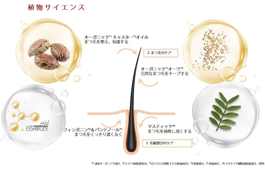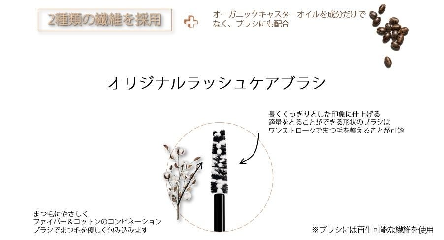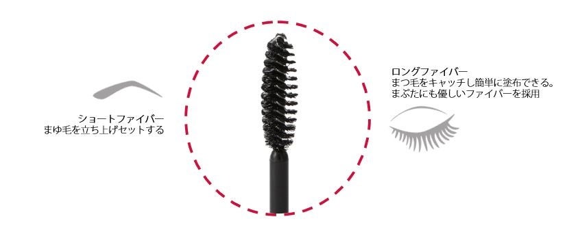左右長さの異なるデュアルブラシでまつ毛用・まゆ毛用に使い分けが可能。オーガニック*3クランベリーオイル*4とパンテノール*5配合。まつ毛を乾燥などのダメージから守ります。