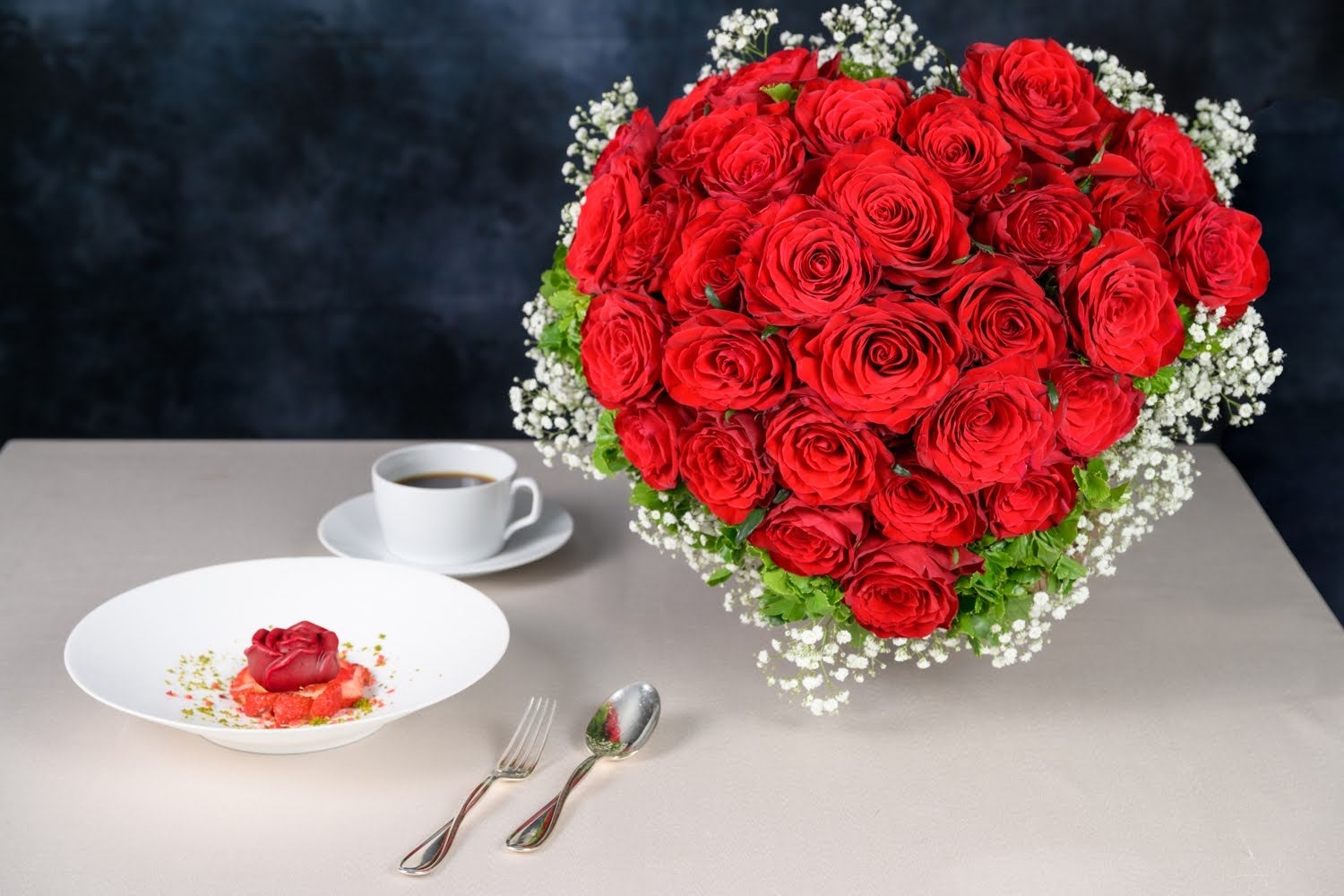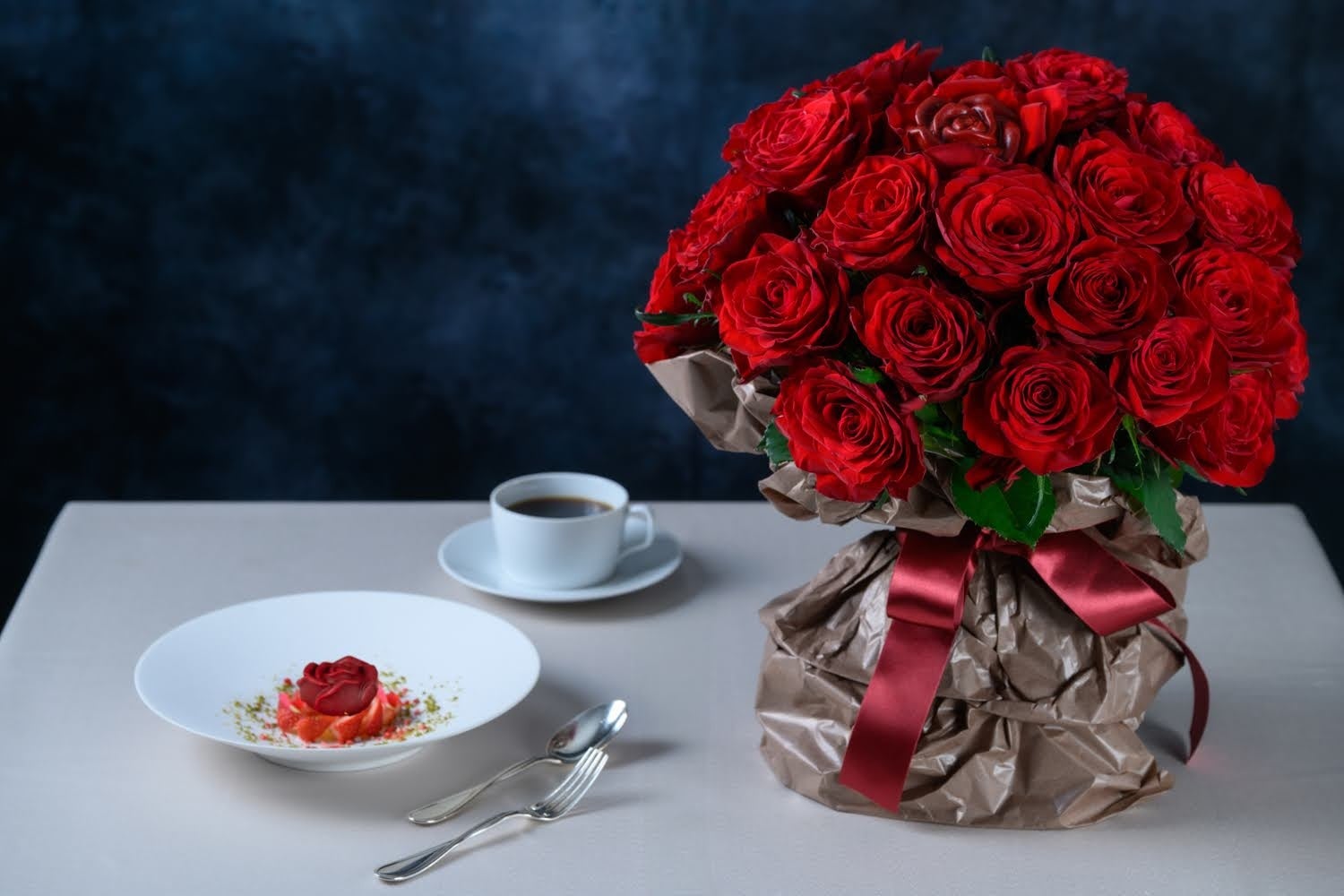 <深紅の薔薇の花束とスイーツ>