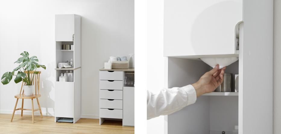 圧迫感を感じさせないスリムサイズながらも、しっかりと収納もできます。上段扉収納の下にある四角い穴からは、扉を開けずに仕舞ったタオルをサッと取り出せます。本体下はスペースを確保した脚高仕様なので、掃除もしやすく、通気性も確保します◎