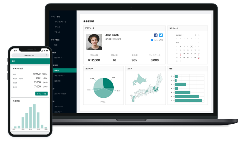 また、MOALA Fan BaseではMOALA Ticketと連動し、来場者情報を収集、集計、分析することができます。これらの情報は興行主やイベント主催者に還元されるため、マーケティング強化、収益向上に寄与、ひいてはイベント業界の一日も早いコロナ禍からの経済的復活にも貢献する狙いもあります。