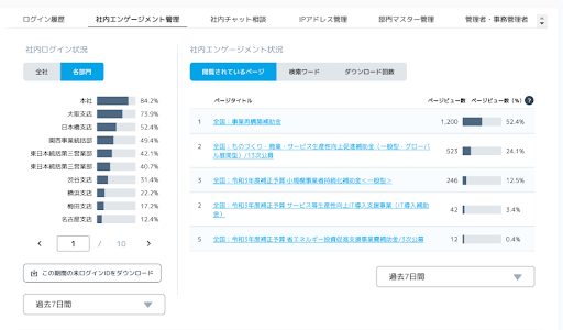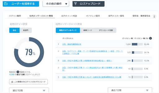 ログイン率、閲覧状況及び資料DL状況など、誰がどんな補助金に興味を持って提案を進めているのかをデータで可視化
