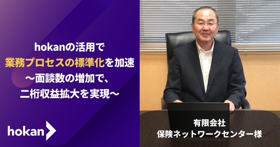 株式会社hokan(ホカン、本社:東京都千代田区、代表取締役:尾花政篤)が提供する、保険代理店向けの顧客・契約管理システム「hokan」を有限会社保険ネットワークセンター(本社:香川県高松市、代表取締役:宮宇地覚、以下:保険ネットワークセンター)に導入いただきました。そして同社の二桁成長にも貢献した活用事例を公開したことをお知らせします。