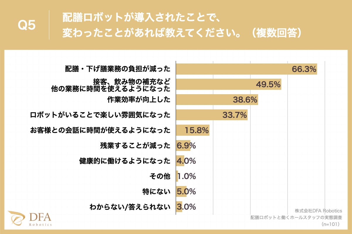 「配膳ロボットが導入されたことで、変化したことはあるか?」という質問に対し「配膳・下げ膳業務の負担が減った」が66.3%、「接客、飲み物の補充など他の業務に時間を使えるようになった」が49.5%、「作業効率が向上した」が38.6%という回答となりました。