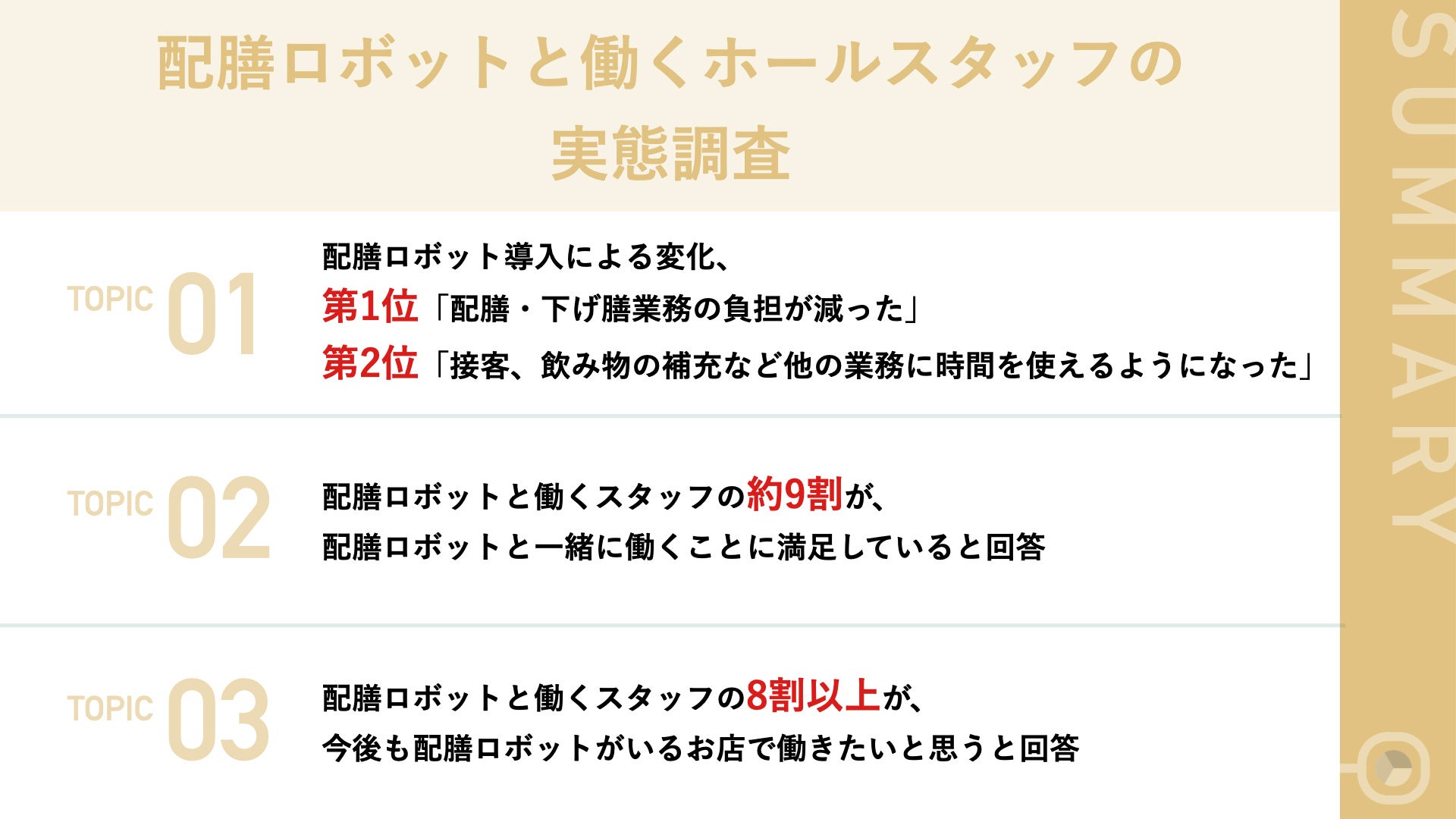 ・Topic 02:配膳ロボットと働くスタッフの約9割が、配膳ロボットと一緒に働くことに満足していると回答