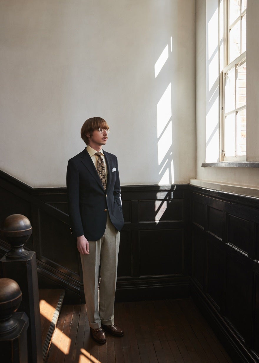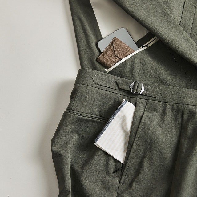 保形性を保ちつつ軽量仕立てのジャケット。見た目にはわからないウエストゴムのスラックス。
