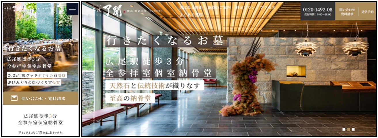 他の高得点霊園・納骨堂サイトと同様に、ファーストビュー付近に主要な要素がまとまっており、かつ、用いている写真素材のクオリティも高く、第一印象で魅力を伝えられるようなサイトになっている。