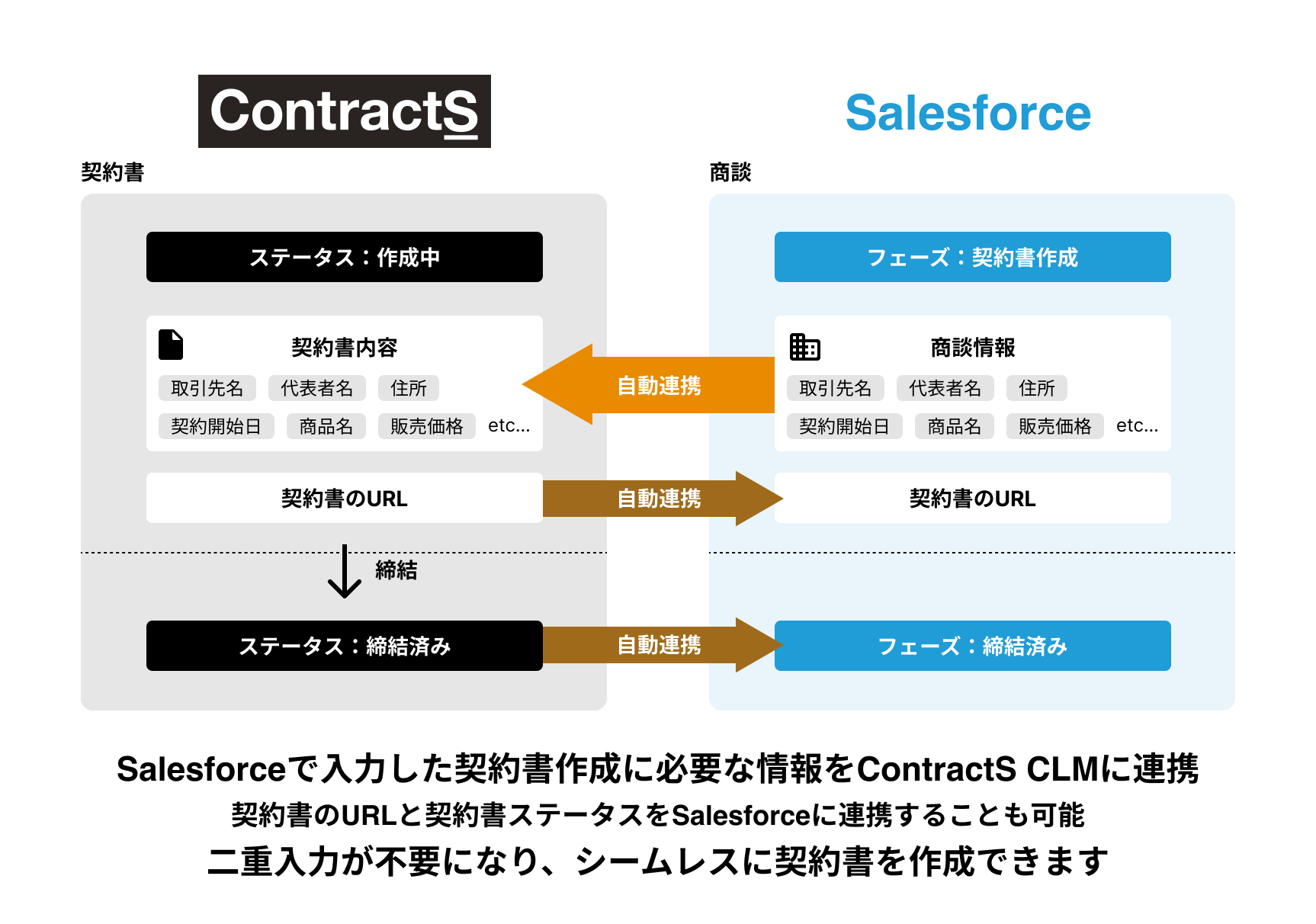 Salesforceで入力した取引先情報や商品情報などの契約書作成に必要な情報をContractS CLMに連携し、下書きとして保存することが出来るアプリです。ContractS CLMで締結した契約書ステータスと契約書リンクをSalesforceに連携することも可能です。