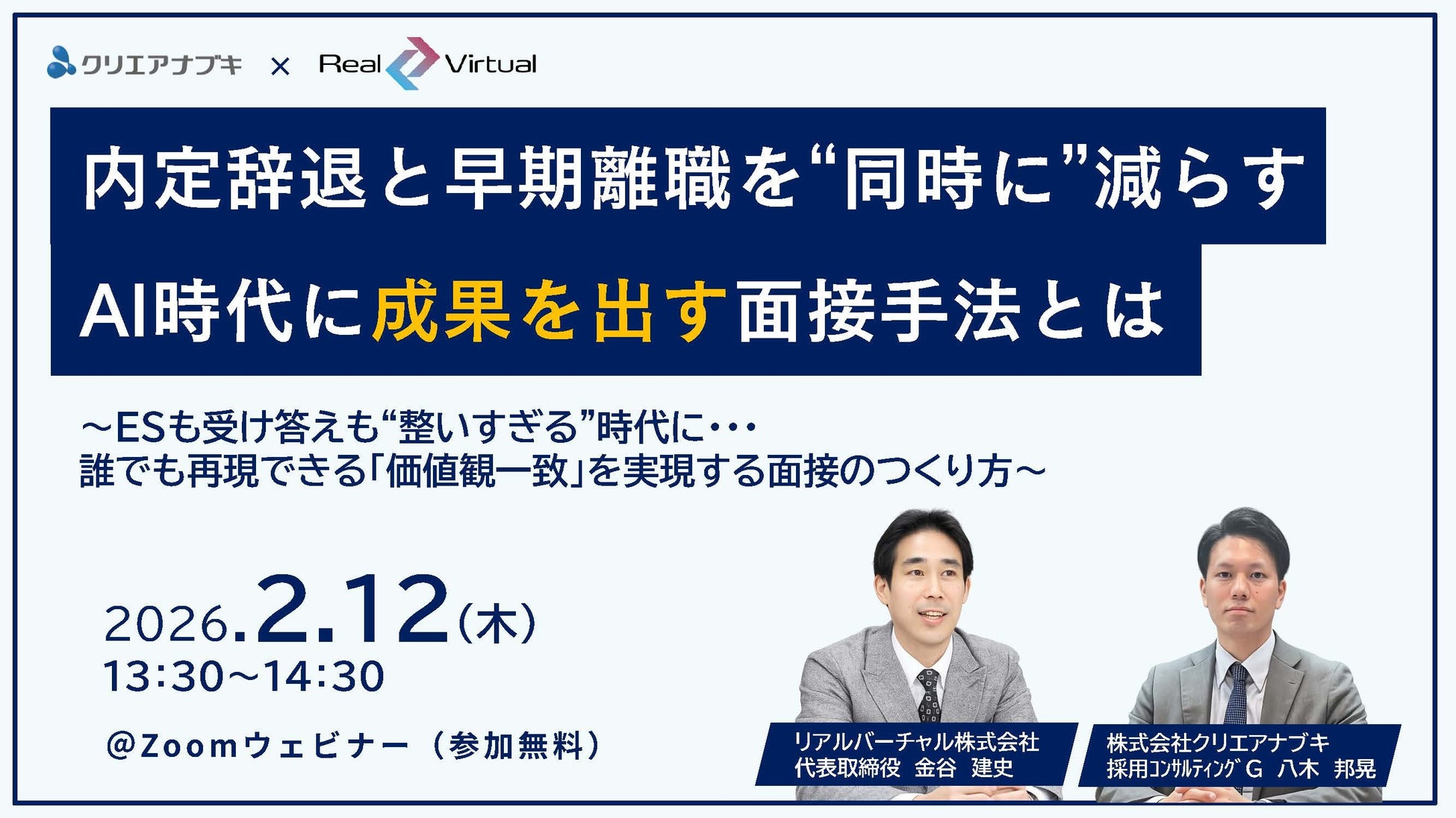 総合人材サービスの株式会社クリエアナブキ(本社:香川県高松市/代表取締役社長 楠戸 三則)は、経営者・採用責任者を対象とした無料オンラインセミナー「内定辞退と早期離職を“同時に”減らす AI時代に成果を出す面接方法とは」を、2026年2月12日(木)に開催します。