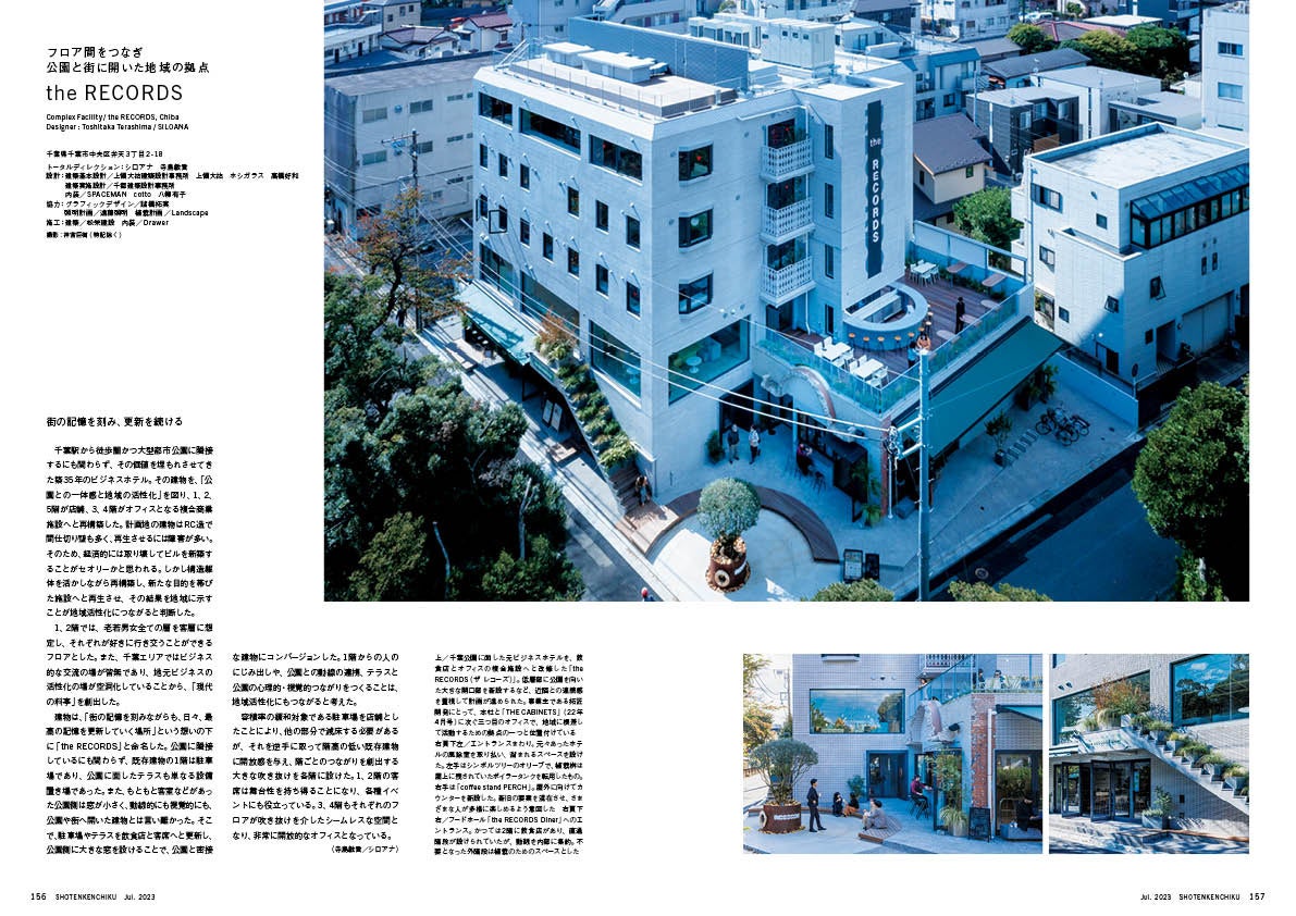 広大な千葉公園に面して立つ「the RECORDS」は、約35年前にビジネスホテルとして計画された建物の改修計画です。かつて駐車場だった1階はフードホールへと姿を変え、上層階には自社オフィスや会員制の飲食店が設けられています。また、2階以上の床に吹き抜けを複数設けることで、緑豊かな公園の居心地を屋内に引き込み、その雰囲気が吹き抜けを介して空中階にまで波及する設計となっています。敷地内に生まれたにぎわいが、千葉市全体に広がっていくことを目的に計画されています。