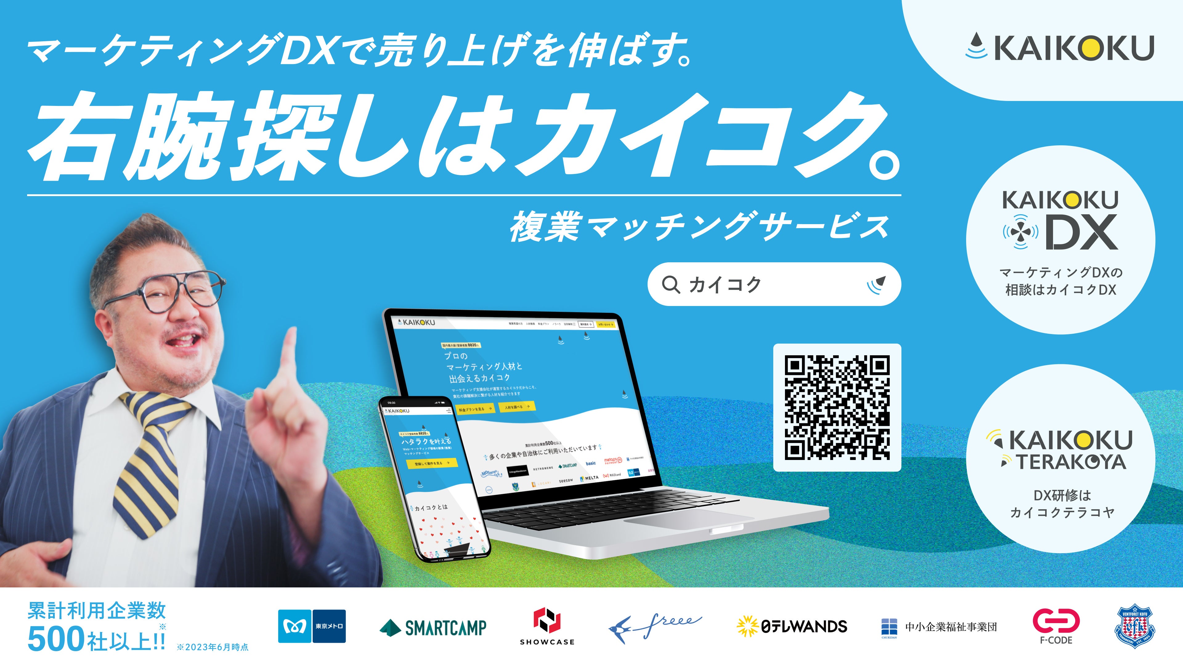 KAIKOKU(カイコク)とは、複業したいデジタル・マーケティング人材と企業をマッチングする複業マッチングサービスです。全国に20,000人いるデジタルマーケターの約2人に1人近くを占める、9,000人以上が登録しています。働き方の選択肢を増やし、弊社のビジョンである「ハタラクを叶える」を実現したいと考えています。
