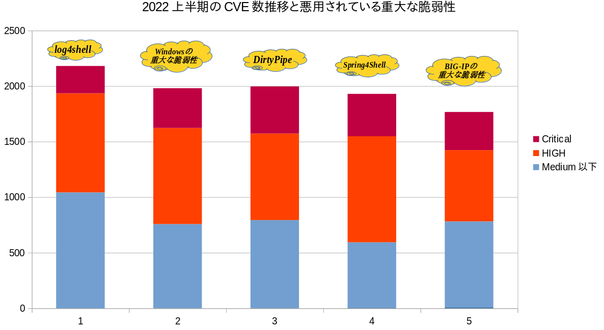 ※2022の5月までに公開された月ごとの脆弱性とCritical/Highの割合のグラフ