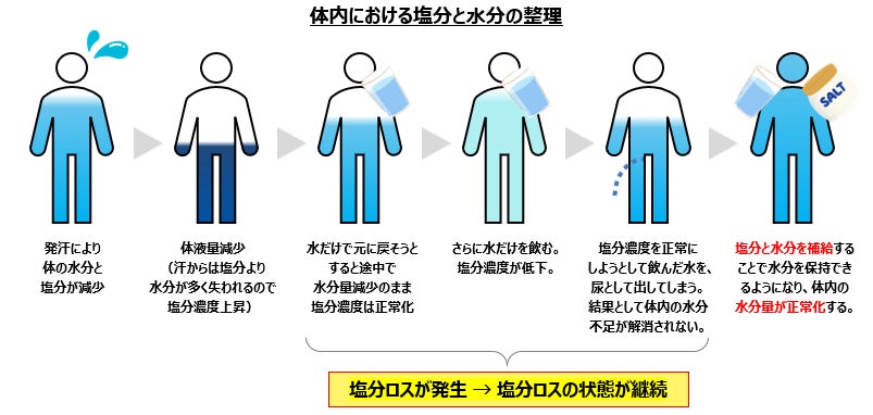 汗などで体から大量の水分を失った時に、塩分を補給せずに水分だけを補給し続けても、水分をキープするためのナトリウムが体内で不足しているため、補給した水分を体内にキープできずに流れ出てしまいます。そのため、塩分不足により、水分を補給しているにも関わらず体内の水分量が正常化せず、様々な体の不調を引き起こします。