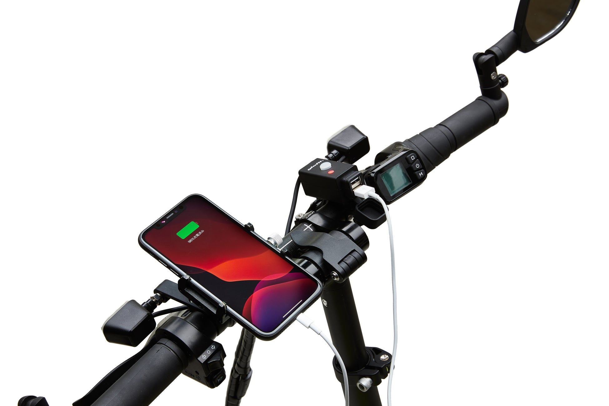 glafitの電動バイクではバッテリーの電源を利用して、オプションのUSB充電器からスマートフォン等への充電が可能です。以前より停電の際の活用方法などをご案内しておりましたが、このところの地震や台風など自然災害への備えとして、お問い合わせを多数いただいております。