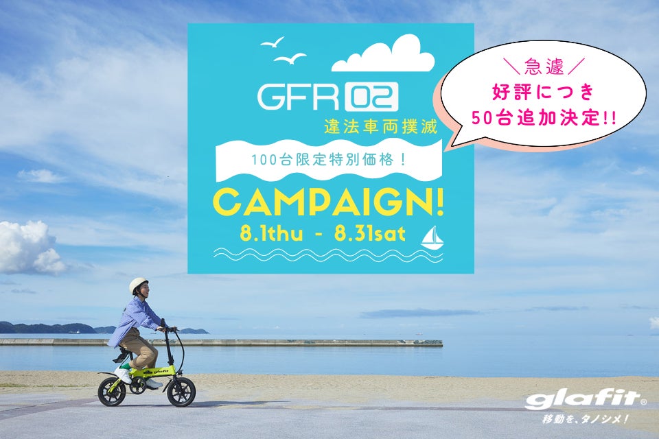 電動パーソナルモビリティの開発から販売までワンストップで⼿掛けるglafit株式会社(読み:グラフィット、本社:和歌山県和歌山市、代表取締役社長CEO:鳴海 禎造、以下、glafit )は、glafit公式オンラインショップにて8月1日(木)から「電動バイクGFR-02」を100台限定で198,000円~の特別価格で販売を開始いたしましたが、好評につき17日に予定販売数に達しました。その後お問い合わせを多数いただいていることから、急遽50台を追加販売することにいたしましたのでお知らせいたします。