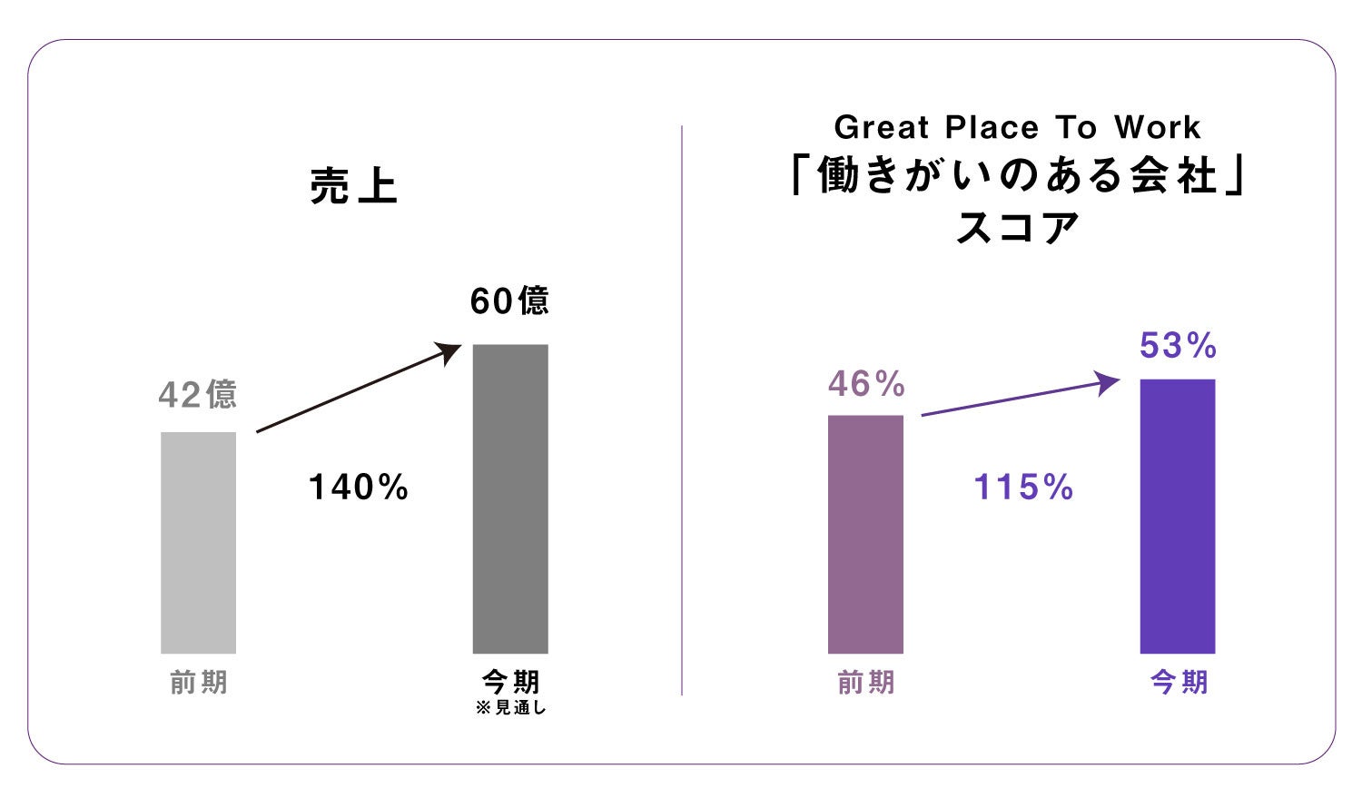 また改善したことは「働きがいのある会社」スコアだけではありません。売上が前期42億から今期60億(見通し)と140%のペースで進捗しています。