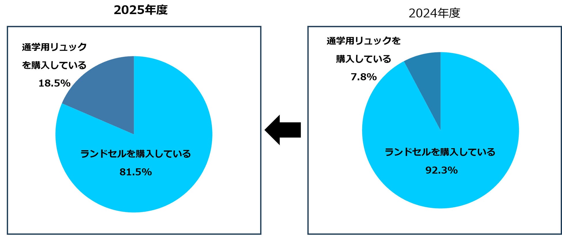 ランドセルを購入する家庭は依然として多数派ですが、その割合は92.3%から81.5%へと約10%減少しています。徐々に「通学用リュック」など他の選択肢も広がりつつあることが伺えます。