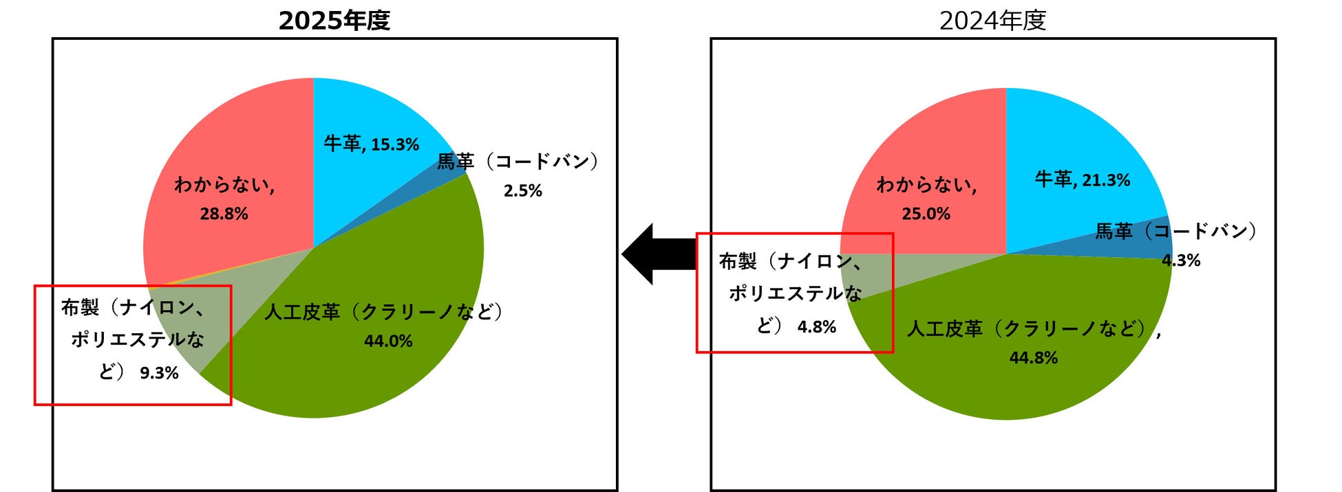 昨年よりも「布製」が増加傾向にあり、牛皮が減少傾向となりました。<質問①>にて通学用リュックが伸びていることもあり、素材の結果にも影響があったと考えられます。