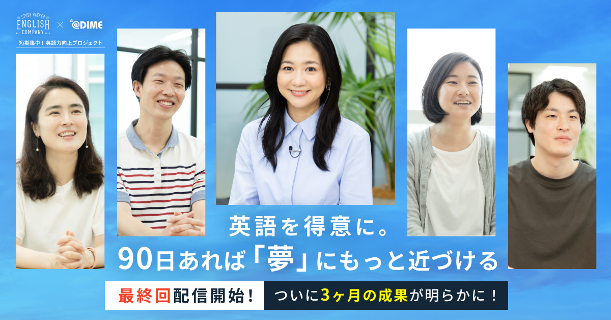 英語パーソナルジム「StudyHacker ENGLISH COMPANY」(https://englishcompany.jp/ )や自習型英語学習コーチングサービス「STRAIL(ストレイル)」(https://strail-english.jp/ )を運営する株式会社スタディーハッカー(本社:東京都渋谷区、代表取締役社⻑:岡健作)は、ビジネスパーソンのためのライフハックメディア「@DIME」との共同企画『「英語で夢を叶えたい」を応援する90日間コーチング。短期集中!英語力向上プロジェクト』の最終回記事の配信を開始いたしました。