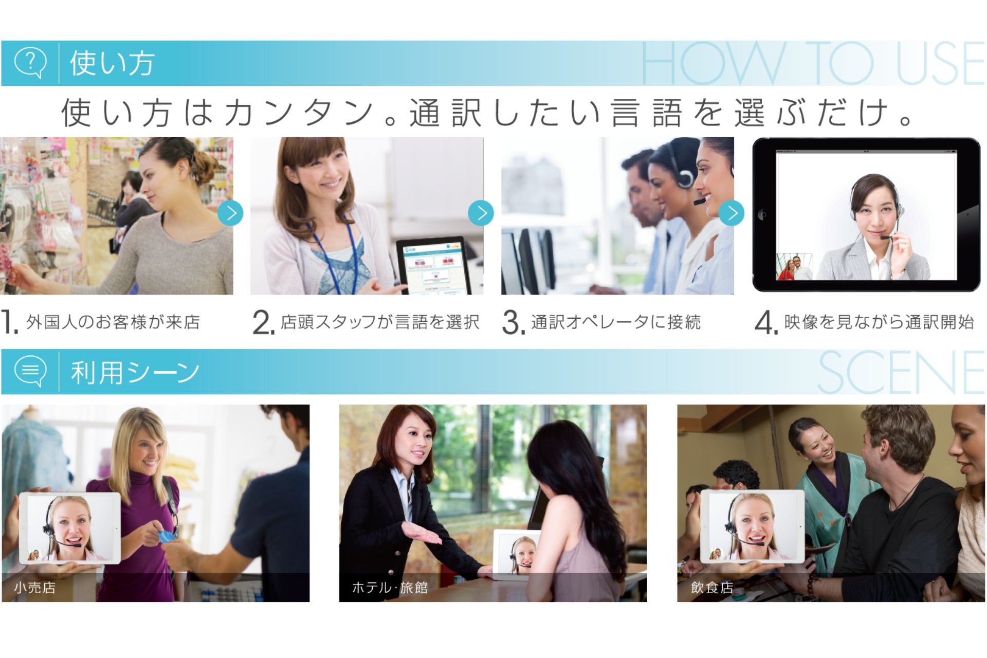 タブレットやスマートフォンからワンタッチで通訳オペレーターにつながり、お客様との接客をサポートする映像通訳サービスです。日本語と外国語が話せる専門の通訳オペレーターとFace to Faceでお互いの顔や表情が見えるため、微妙なニュアンスや機械では判別できない難しい内容でも会話することができます。