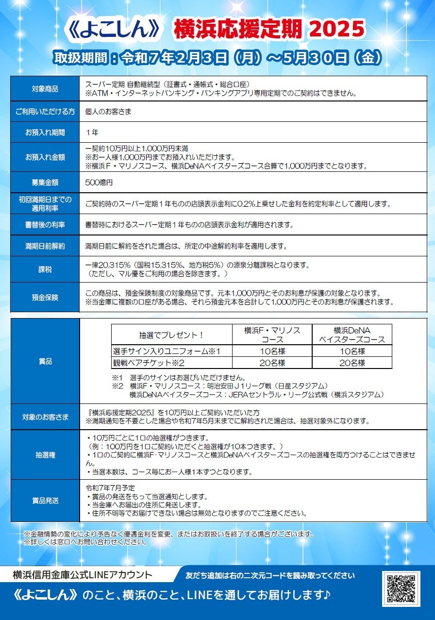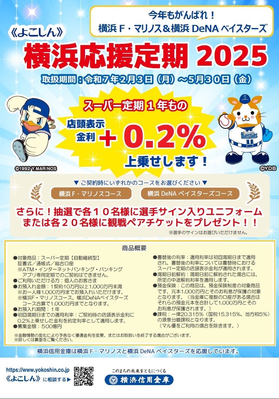 横浜信用金庫(横浜市中区 理事長 春日 隆)は、横浜を地盤とする人気プロスポーツチームである横浜F・マリノスおよび横浜DeNAベイスターズを地域の皆様さまと応援するため、「《よこしん》横浜応援定期2025」の取扱いを開始します。