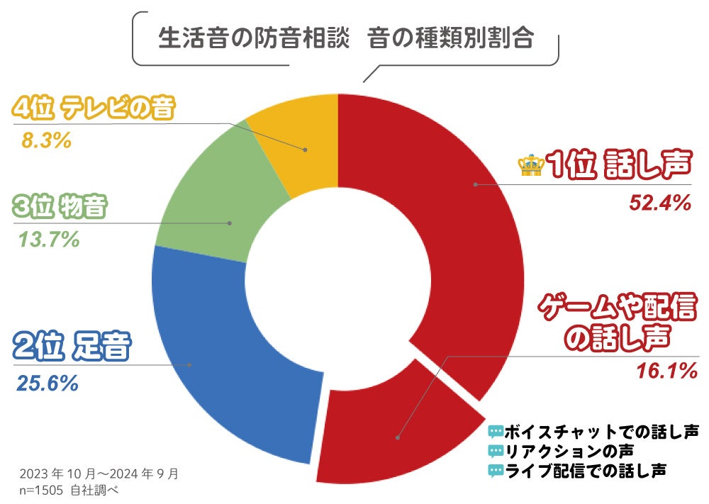 ピアリビングに寄せられる防音相談を音の種類別に分析したところ、「話し声」に関する相談が全体の52.4%を占め、最も多い相談内容となっています。その中でも、「ゲームや配信中の話し声」に関する相談が16.1%と、オンラインゲームのボイスチャットや配信時の声が特に問題視されていることが分かります。