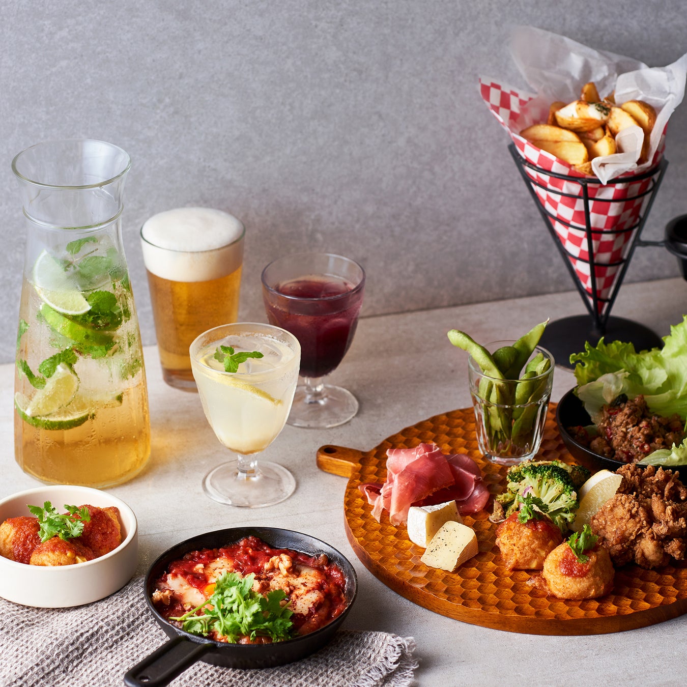 スイート&サワーフライドポテト ¥680/おつまみパラダイス ¥1,800 / フラメンコEGGチーズグラタン ¥880 /タイ風山芋さつまあげ¥550 / ミントとライムのモヒート¥2200(JUG・ノンアルコール)/ ドラフトビール ¥640