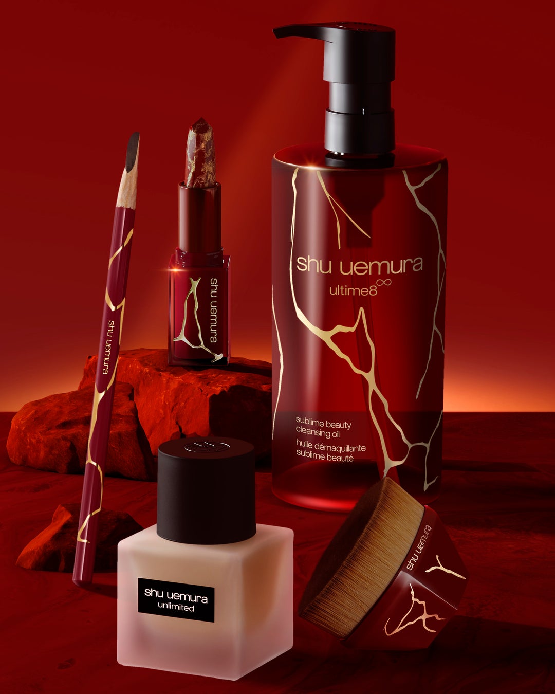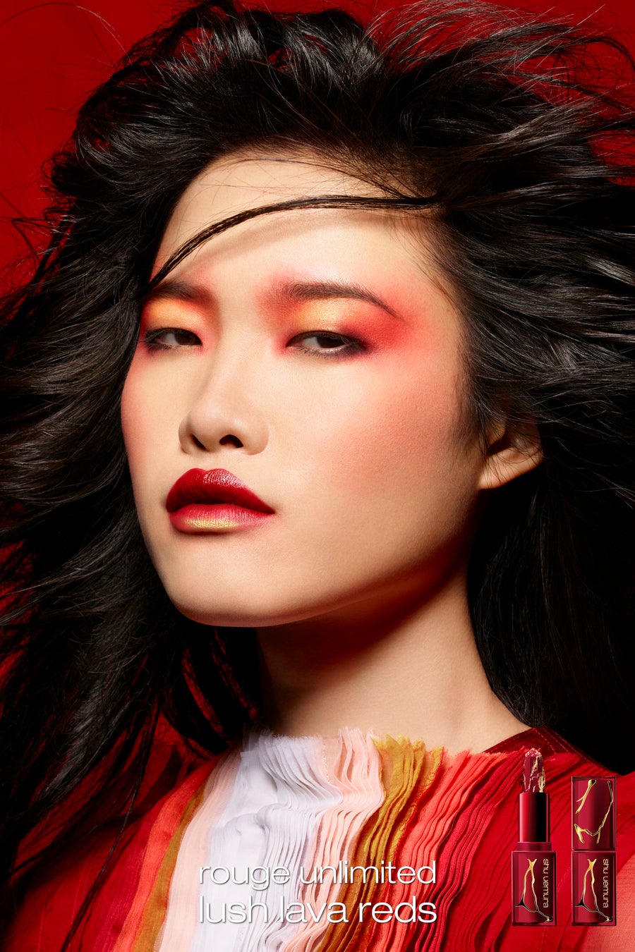 新年を祝し、シュウ ウエムラを代表する3つのアイコンアイテムが華麗なルージュ アンリミテッド ラッシュ ラヴァ レッド コレクションのデザインで登場。