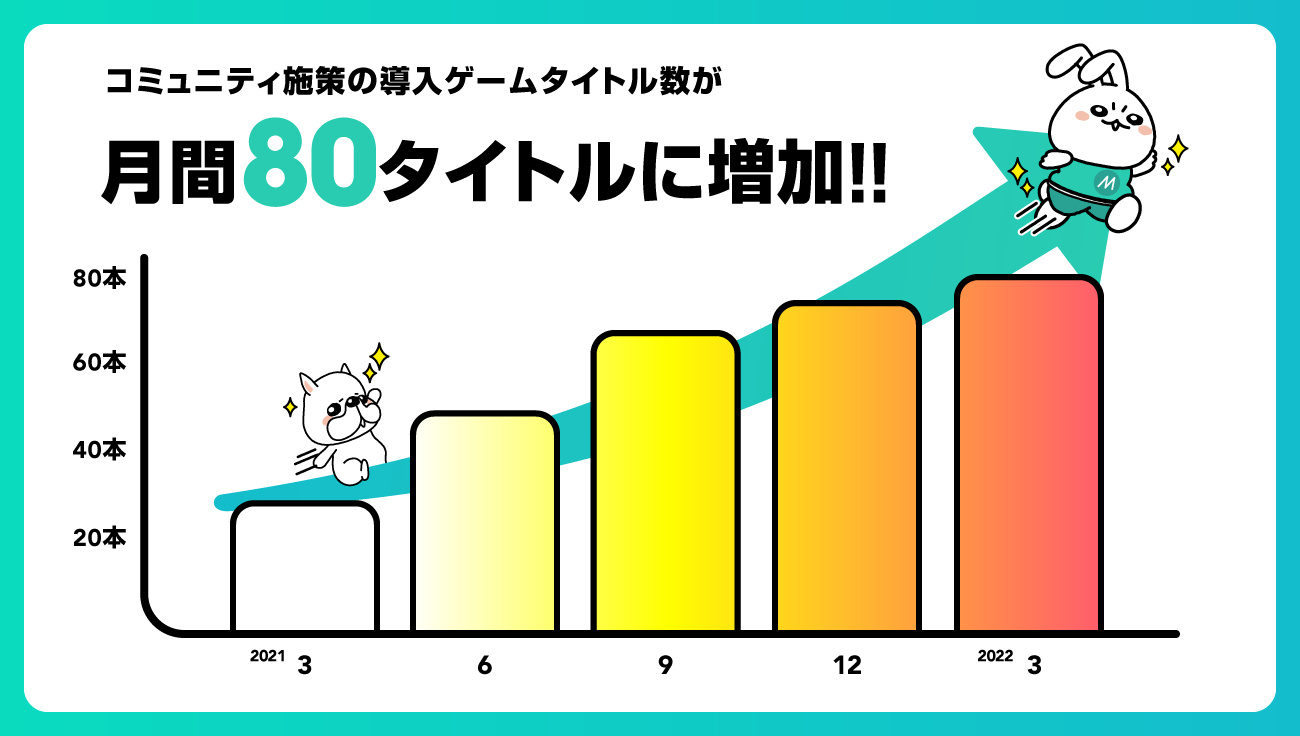 2022年3月にはコミュニティ施策の導入ゲームタイトル数が80件に増加しており、多くのゲーム企業さまにご実施、リピートいただいております。