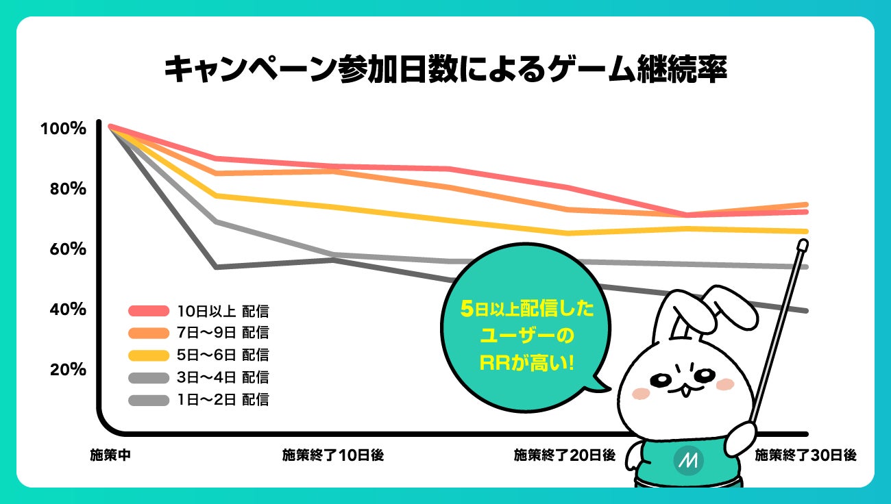 今回更に過去施策の結果を分析したところ、施策実施中5日以上配信したユーザーの継続率が特に高いことが判明しました。