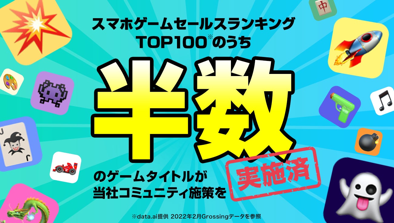 また、さらに、直近の調査では2022年2月時スマホゲームセールスランキングTOP100(※2)のうち、半数のゲームタイトルが過去当社のコミュニティ施策を実施いただいたこともわかりました。ゲーム会社さまから長期的なゲーム売上向上のための定番施策として支持を拡大しています。