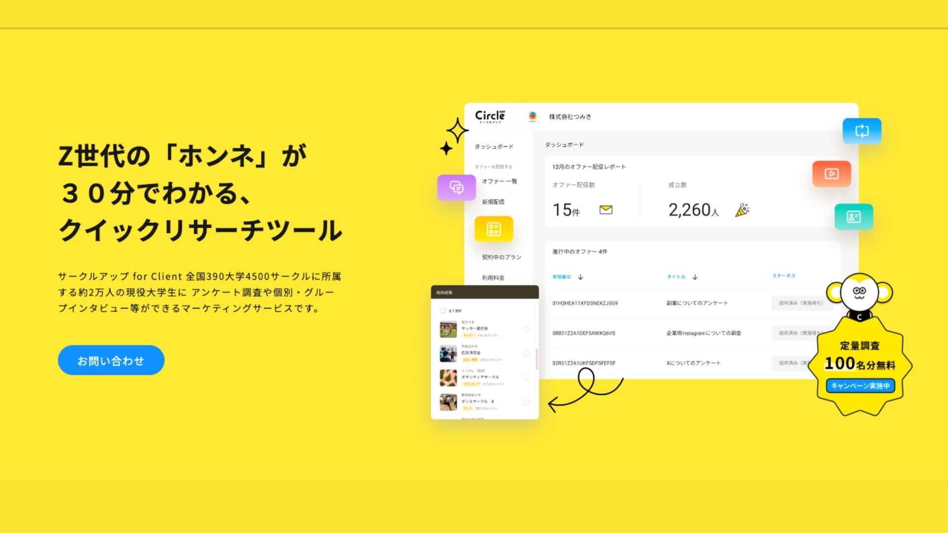 サークルアップは電通若者研究部が自らの研究ツールとして開発し、2022年6月に当社が事業売却を受けたクイックリサーチツール。約2万人の現役大学生が登録しており、100サンプルの調査が10〜30分で完了するなど、そのスピード感が特徴で、多くの企業様のマーケティング活動やリクルーティング活動にご活用いただいています。