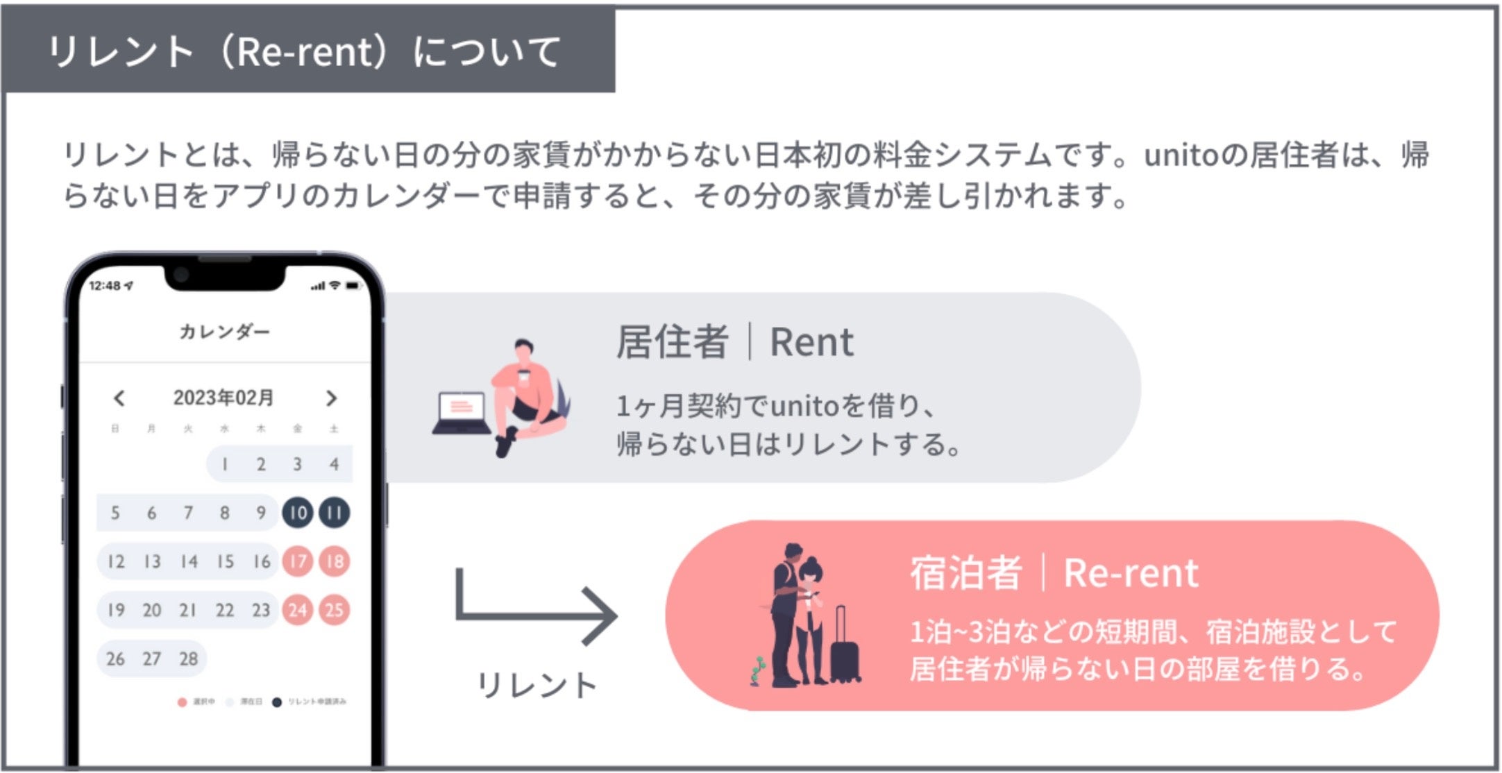 さらに、日本初の家賃システム「リレント」を採用しており、帰らない日は、部屋をホテルとして貸し出す(リレントする)ことで、その分の家賃を減額します。