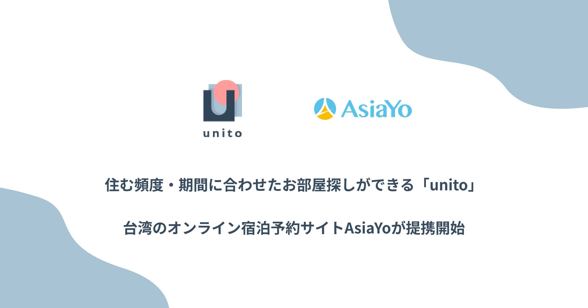 帰らない日は家賃がかからない住まいなど、住む頻度・期間に合わせたお部屋探しができるプラットフォーム「unito」を提供する株式会社Unito(所在地:東京都千代田区、代表取締役:近藤佑太朗、以下「ユニット」)は、台湾最大の民泊・バケーションレンタル・ホテルOTAサイト「AsiaYo.com」を運営するAsiaYo Co., Ltd(本社:台北市、CEO:Cheng Chao-Kang、以下、「AsiaYo」)と業務提携いたしました。