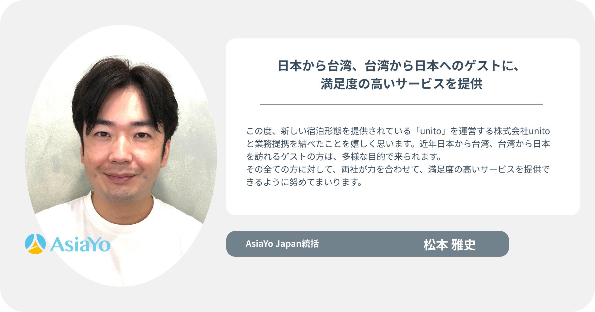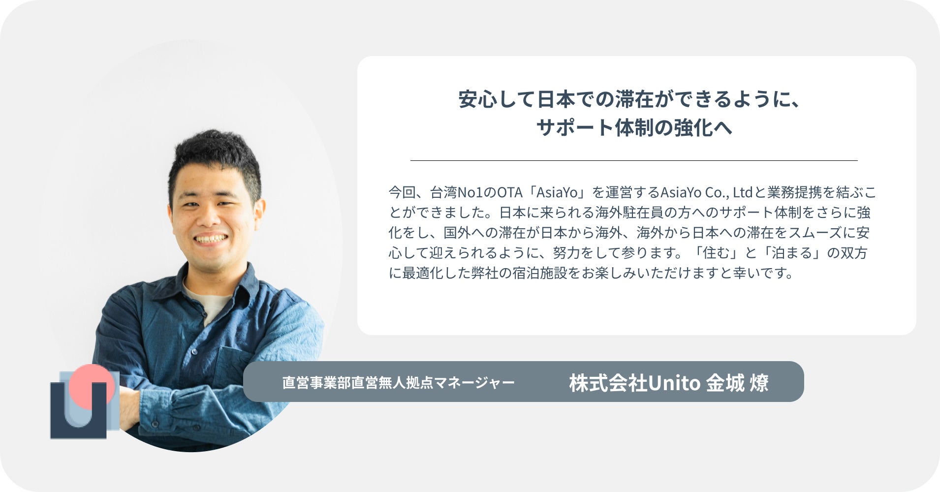 昨今の急速なインバウンドビジネスの回復のなかで、ユニットが所有する中期滞在に最適な施設をAsiayoのお客様にお届けすることで、台湾から日本への出張において、より快適な体験をお届けできないかと思い、この度の業務提携にいたりました。