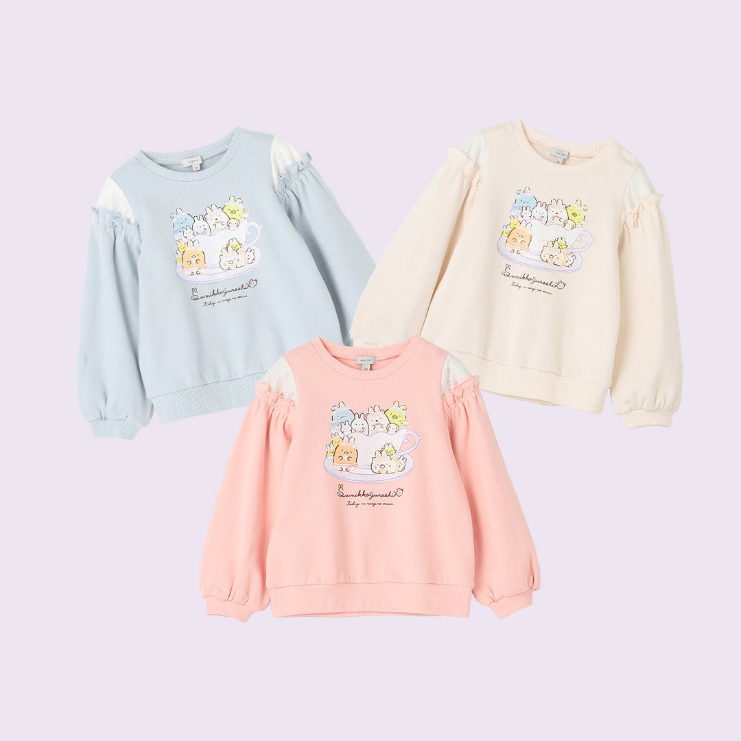 今回は、第2弾となる『すみっコぐらし』デザインの子供服を提案します。肩部分がレースになったレイヤード風デザインと、『すみっコぐらし』のキャラクターがポシェット風にデザインされた2種類のトレーナーを展開。さらに、総柄デザインとチェックのボトムスがセットになったルームウェアをオンラインサイト限定で展開します。ルームウェアのボトムスは、ハイウエスト仕様で冷えが気になるお腹周りまでしっかりと守ってくれます。