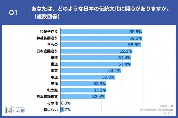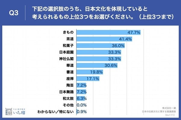 きもの着方教室 いち瑠(https://ichiru.net/)を展開する、株式会社一蔵(本社:東京都千代田区、代表取締役社長:河端義彦)は、日本文化に興味のある女性111名を対象に、日本の伝統文化に関する意識調査を実施いたしましたので、お知らせいたします。