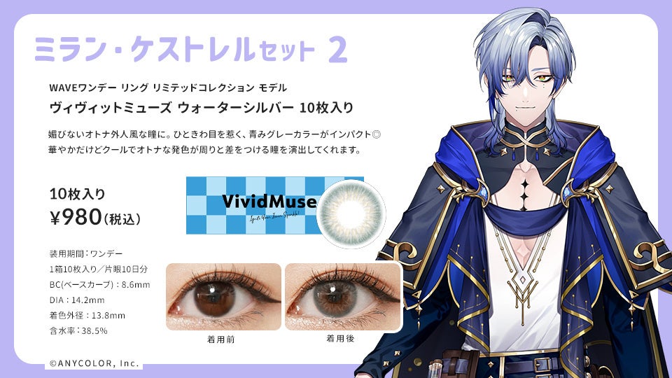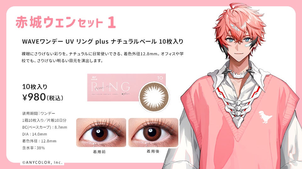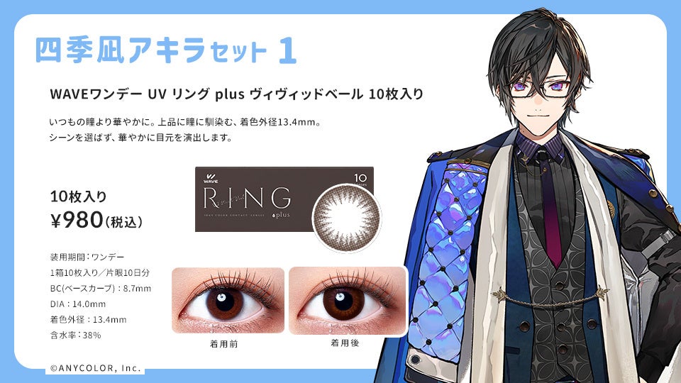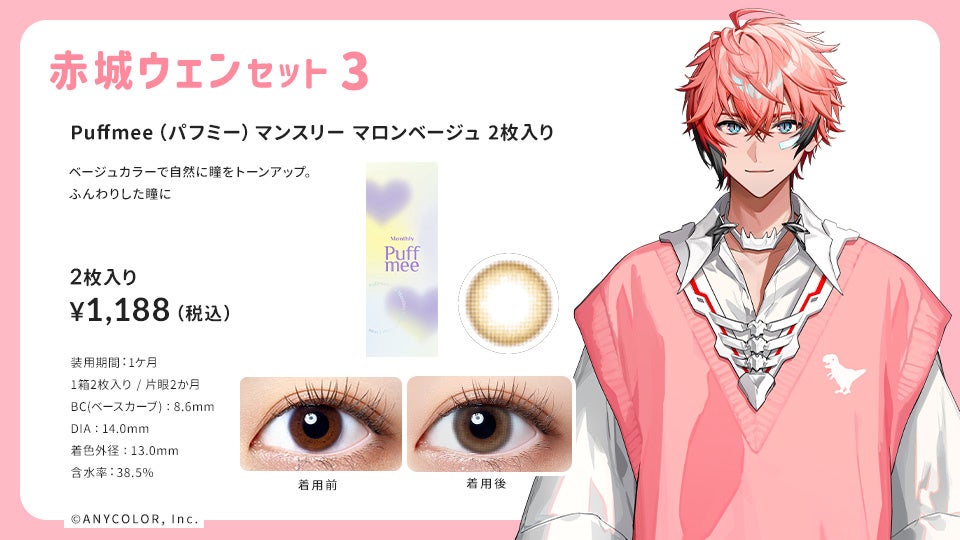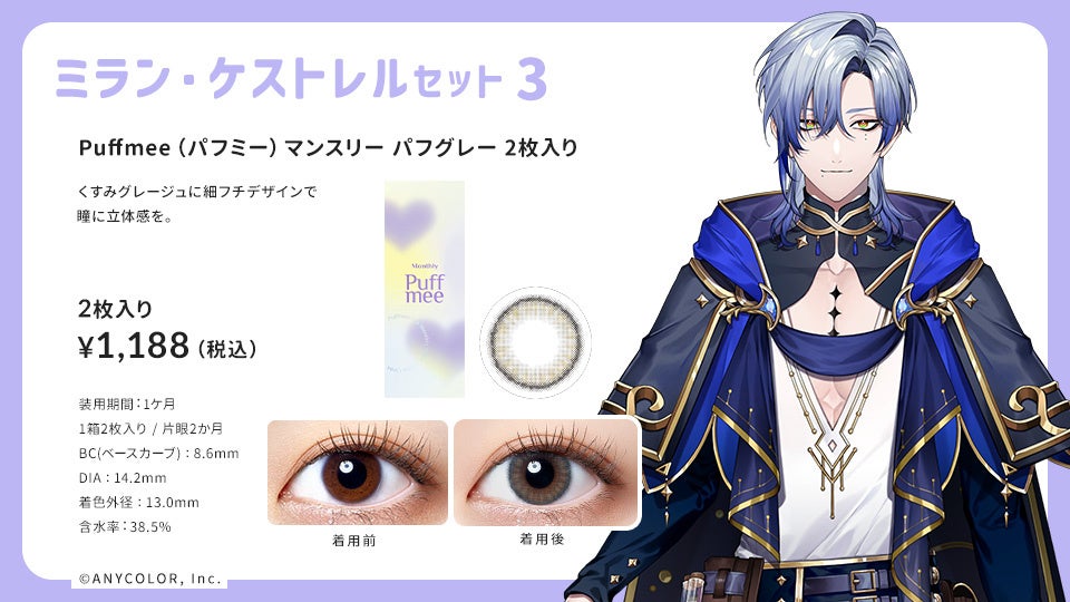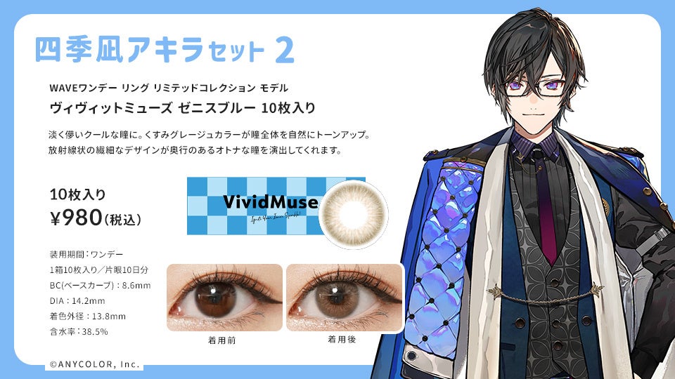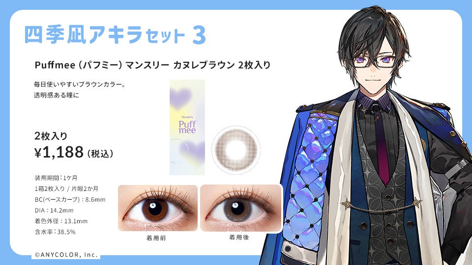 赤城ウェンさん、四季凪アキラさん、ミラン・ケストレルさんがそれぞれオススメするカラーコンタクトレンズセットを期間限定で販売いたします(※期間終了後は、通常通り個別販売となります)。