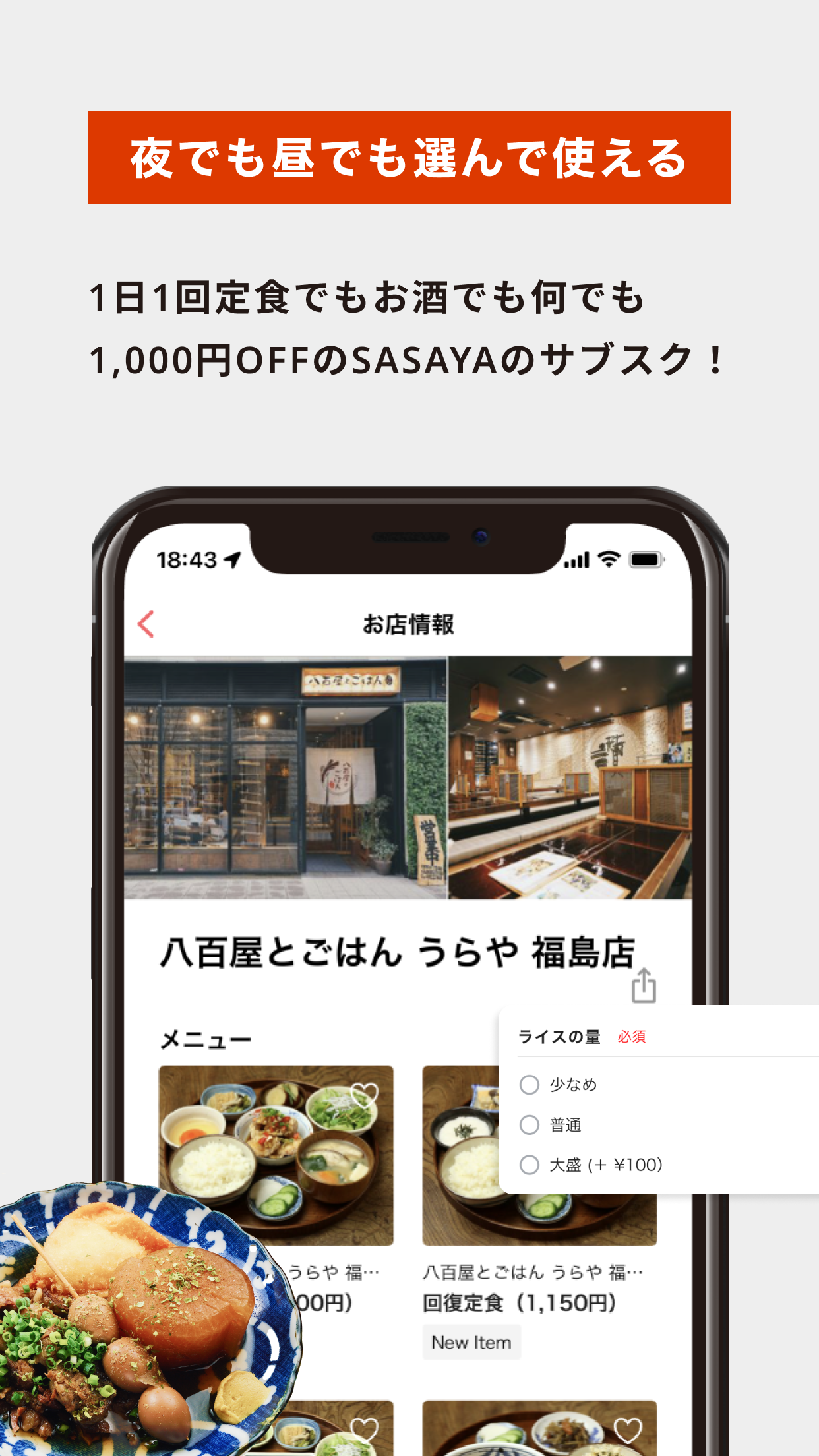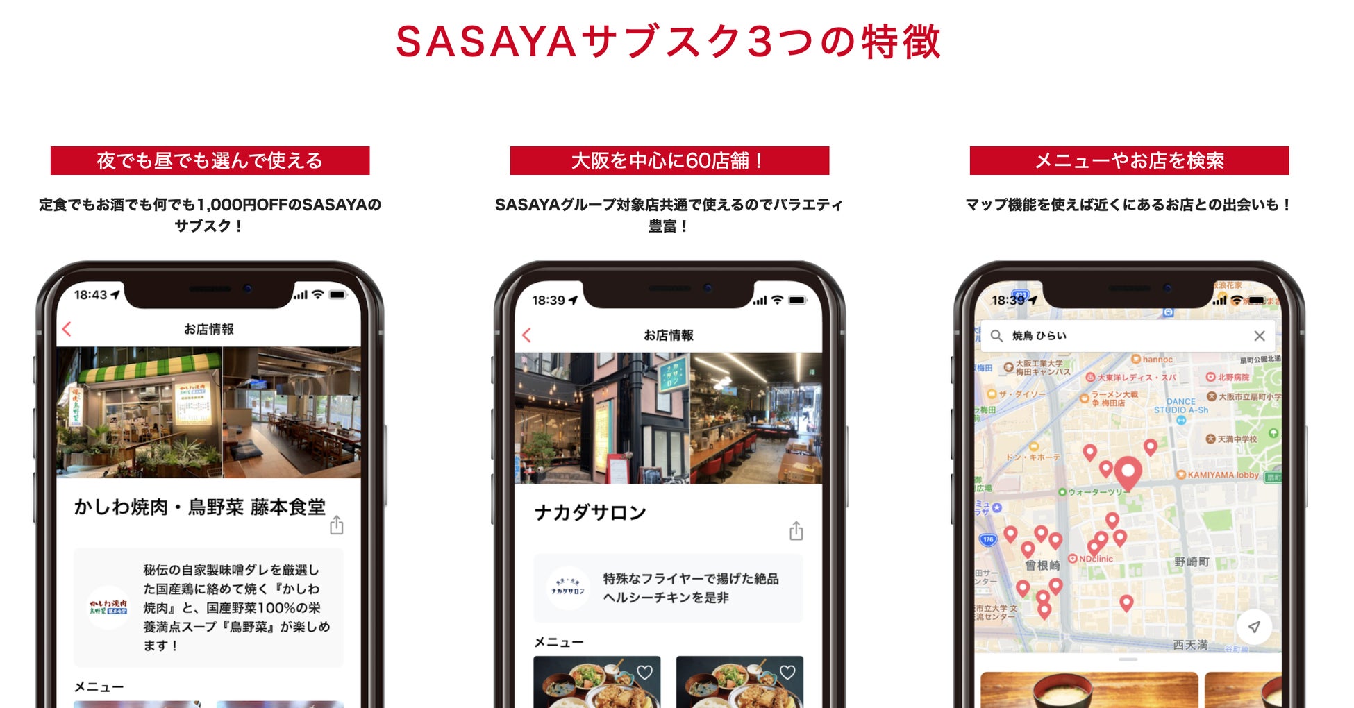 弊社SASAYAホールディングスは大阪では約60店舗展開しており、ほとんどの店舗が異なる業態で営業しております。炭焼き料理、和食、洋食、焼肉、蕎麦、中華、タイ料理など、多様なジャンルです。ランチ営業をしている店舗や、朝4時まで営業している居酒屋業態まであります。居酒屋業態でも定食をご提供しており、またこのサブスクは1,000円オフというサービスですので、飲みのシーンでもご利用頂ける、使い勝手が豊富なサービスでございます。
