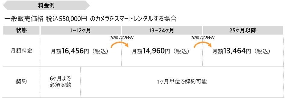 スマートレンタルは、常に最新モデルのカメラを手軽に利用したいプロフェッショナルのためのレンタルサービスです。中長期でのご契約を前提に、一般的なレンタルサービスよりも手頃な価格で新品カメラのレンタルサービスをご提供し、万が一の自然故障や破損時には、迅速に整備済みの機材に交換します。また、リースやクレジット等と比較し、制約期間が短く(最低レンタル期間6ヶ月)、ビジネス環境に応じた最新機種への変更などが可能です。 また、解約手続きもシンプルで手軽です。