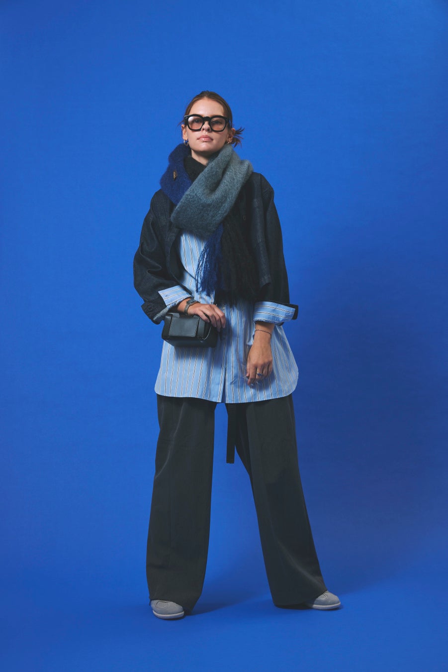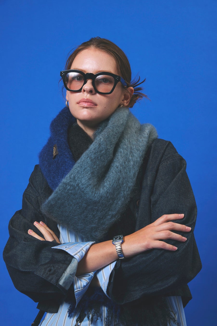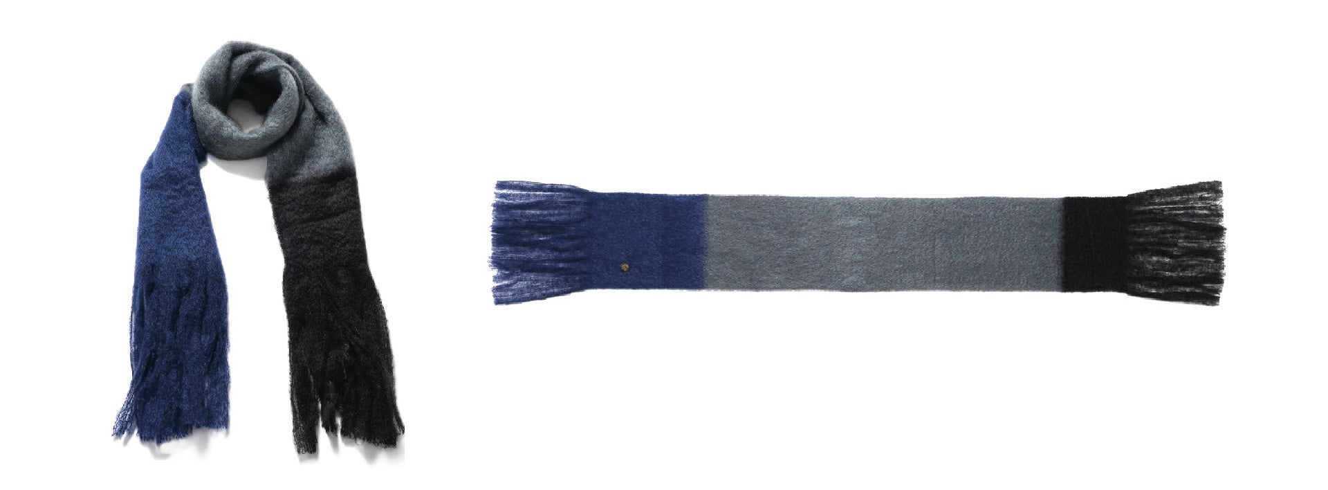 毎日ワードローブに寄り添うカラーリングを意識した、グレーをベースにブルーとブラックを組み合わせたデザイン。まるで、冬の夜空のように静かで深みのある色彩です。鮮やかなブルーをアクセントに加え、シンプルながらも印象的な一品に仕上がりました。冬に多くなりがちなモノトーンのコーディネートにも自然と馴染み、日常のスタイルに彩りをプラスしてくれます。
