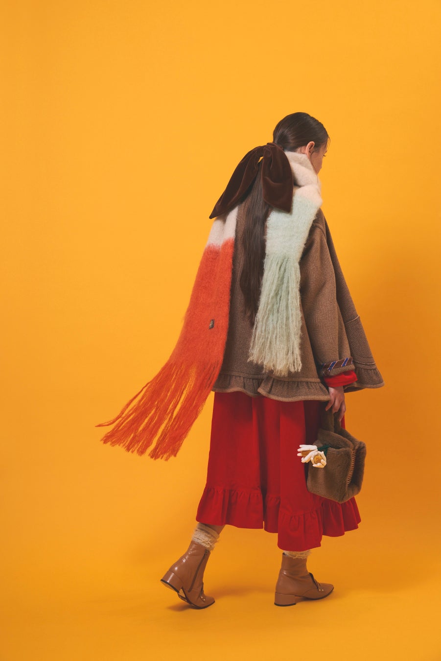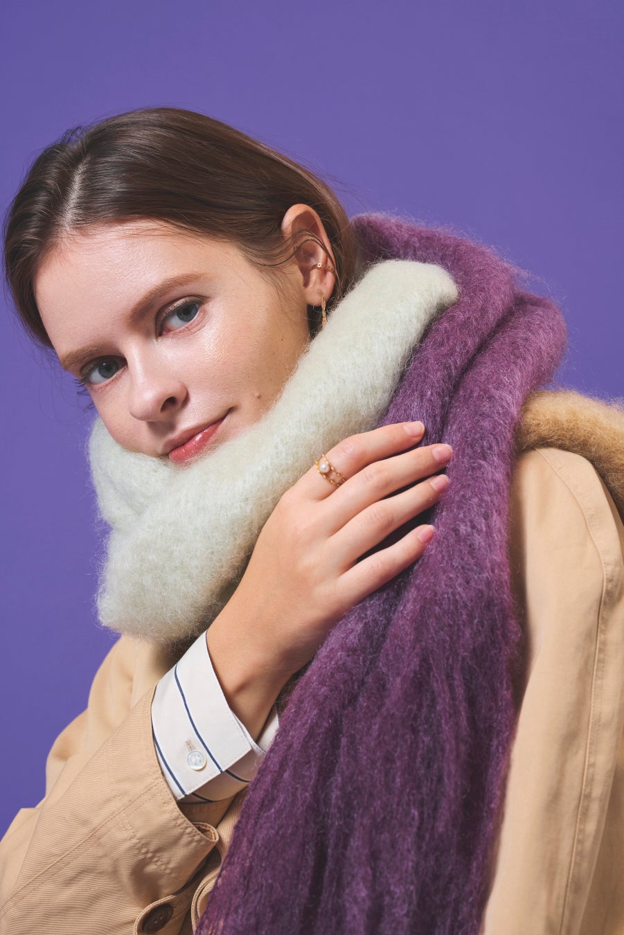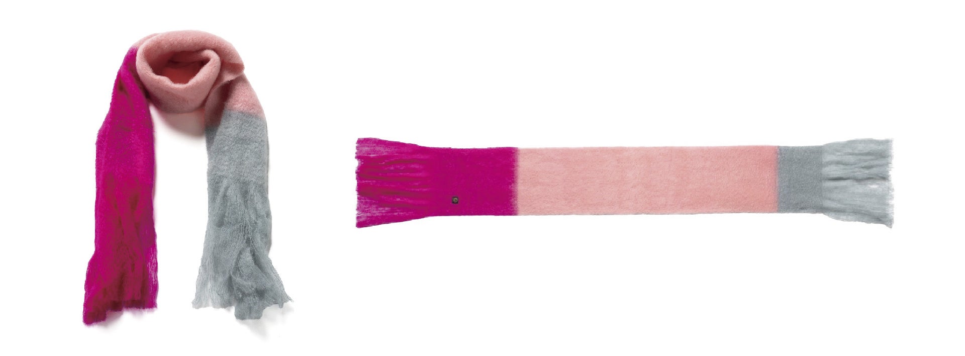 ピンク好きが、ピンク好きな大人の女性のために監修したデザイン。淡いグレイッシュなピーチピンクをベースに、アクセントとなるビビットのショッキングピンク、甘くなりすぎない柔らかなブルーグレーの3色で、冬の装いに首元がパッと明るくなるストールに仕上がりました。