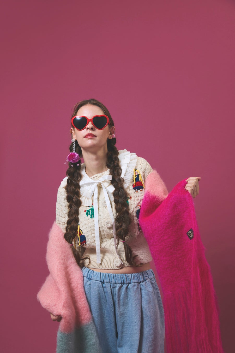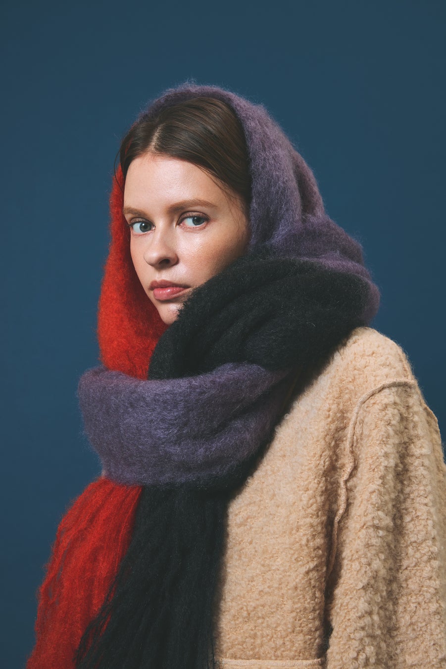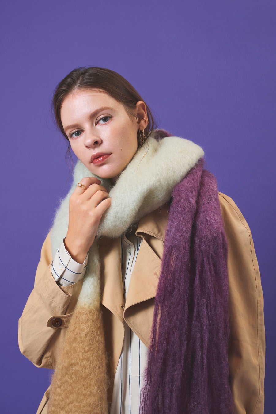 ピンク好きが、ピンク好きな大人の女性のために監修したデザイン。淡いグレイッシュなピーチピンクをベースに、アクセントとなるビビットのショッキングピンク、甘くなりすぎない柔らかなブルーグレーの3色で、冬の装いに首元がパッと明るくなるストールに仕上がりました。
