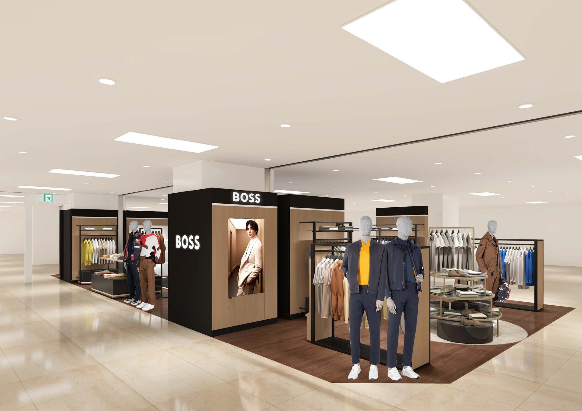 BOSS メンズウェアを展開する売場面積97.1㎡に拡張した店舗では、ビジネスウェアからカジュアルスタイルまで、モダンで洗練されたアイテムを幅広く展開。さらに、BOSSを象徴するアイコニックカラーのブラック、ホワイト、キャメルの3色を施したアイテムや、モノグラムなどのブランド刷新後の商品も取り扱っております。