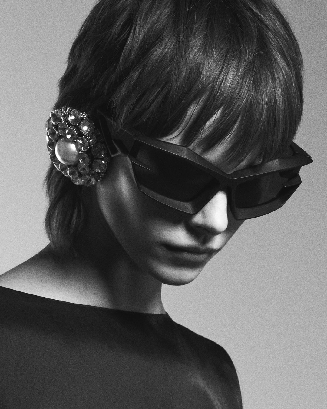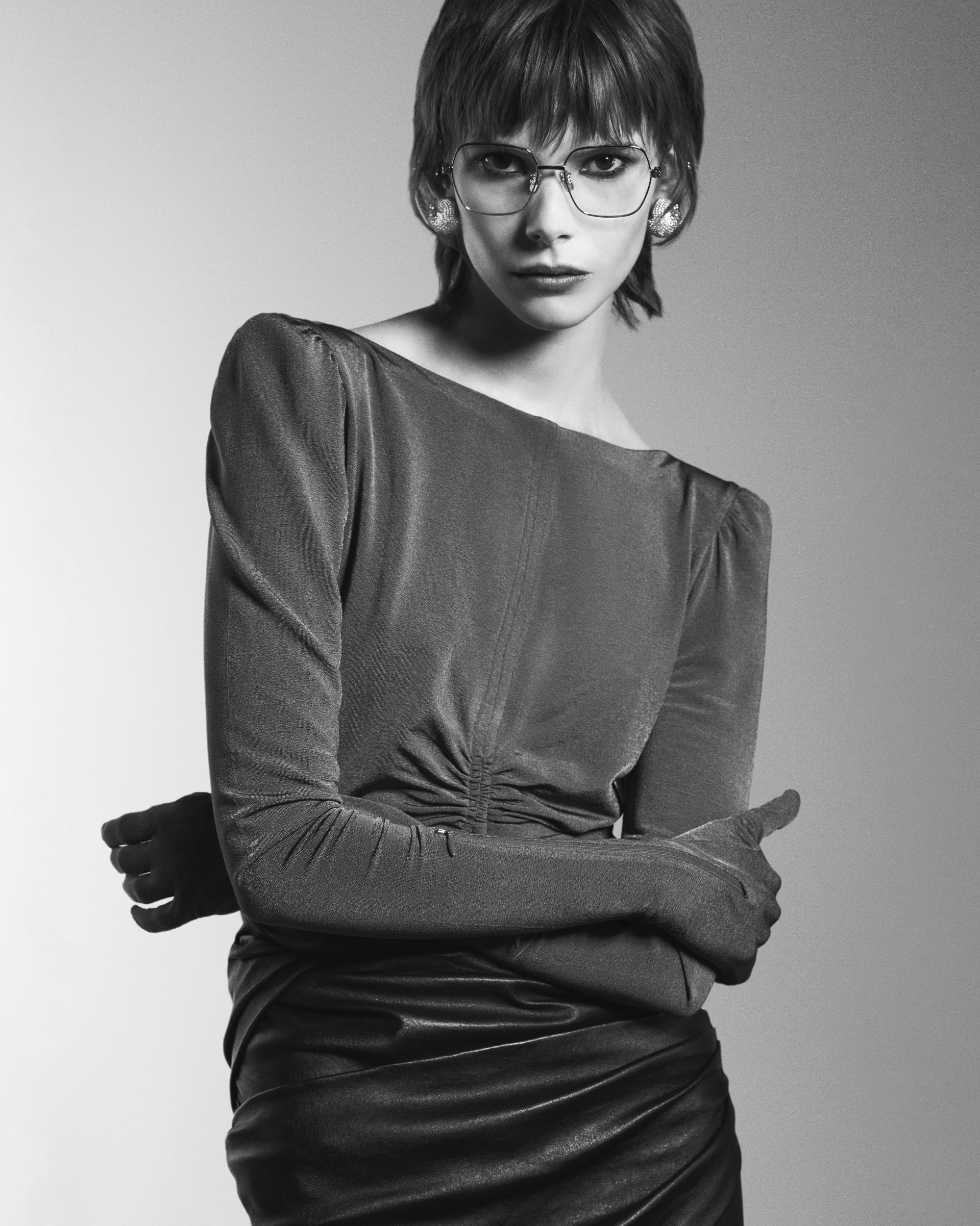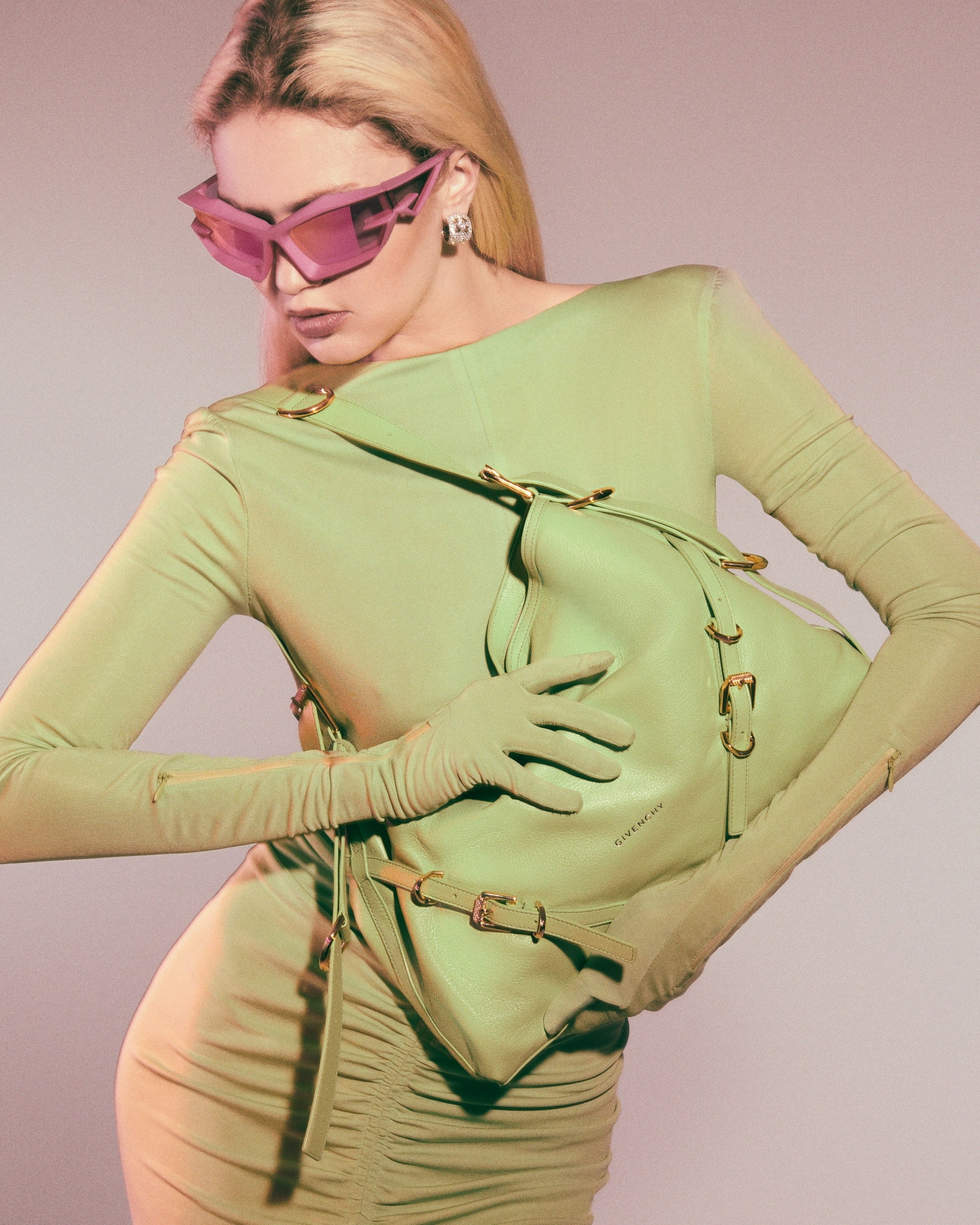 ブラジル人モデルのルナ・パッソスは、ギャザースカートとグローブ一体型のトップスを身に着け、『ヴォワイユー』のハンドバッグを肩掛けしています。アイウェアでは、ナイロン製の3Dプリントで作られた新しいサングラス『GIVカット』が、今シーズンのルックにドラマティックで贅沢な印象を与えています。